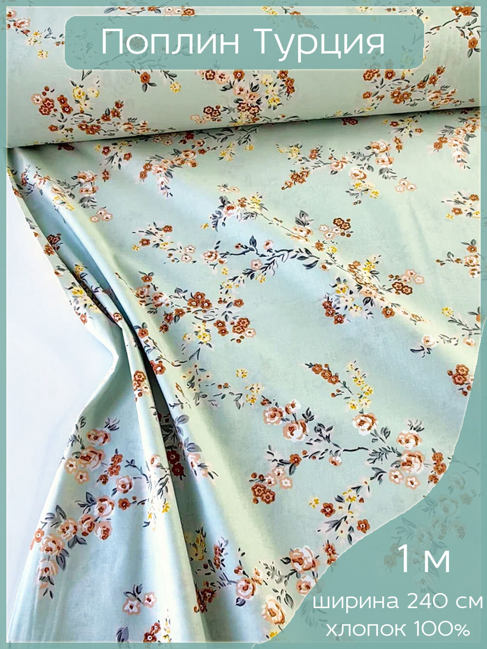 Ткань для шитья в стиле Прованс, 100 % хлопок поплин Турция, цветочки на мятном фоне, 1 м х 240 см