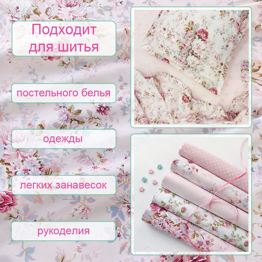 Ткань для шитья в стиле шебби-шик, 100 % хлопок поплин Турция, белый с розовыми розами, 1 м х 240 см