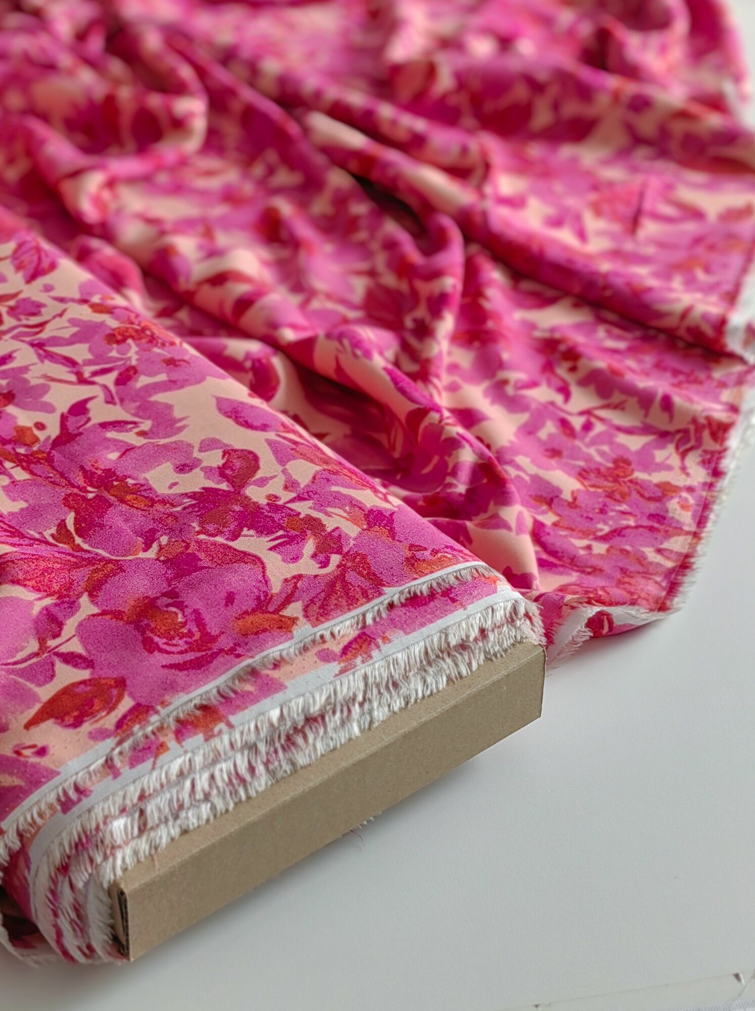 Ткань для шитья блуз, платьев, юбок 100% Вискоза штапель с крупными ярко-розовыми цветами цветами на кремовом 186х140 см