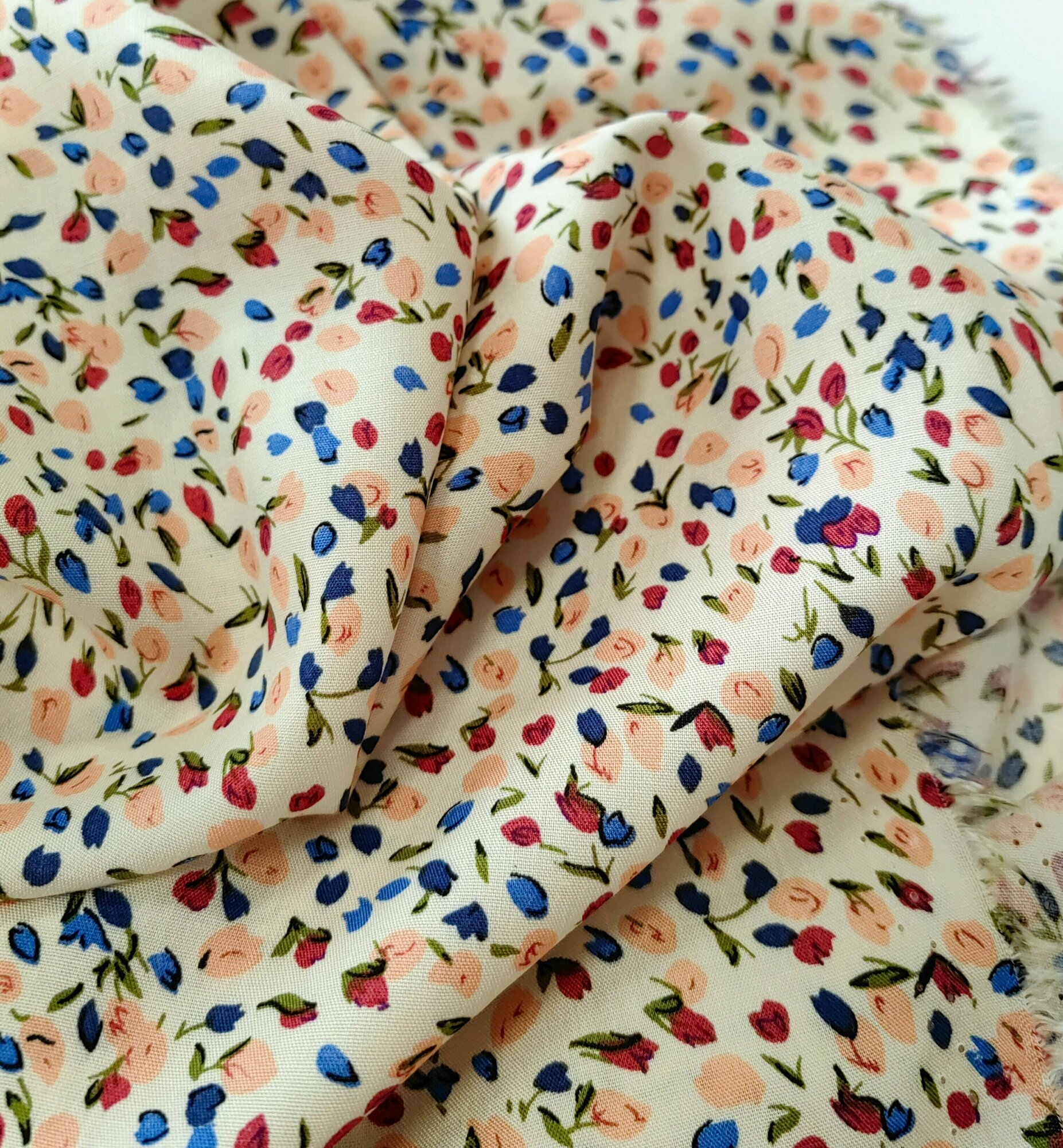 Ткань для шитья блуз, платьев, юбок 100% Вискоза штапель с мелкими тюльпанами на бежевом 100х140 см интересное: