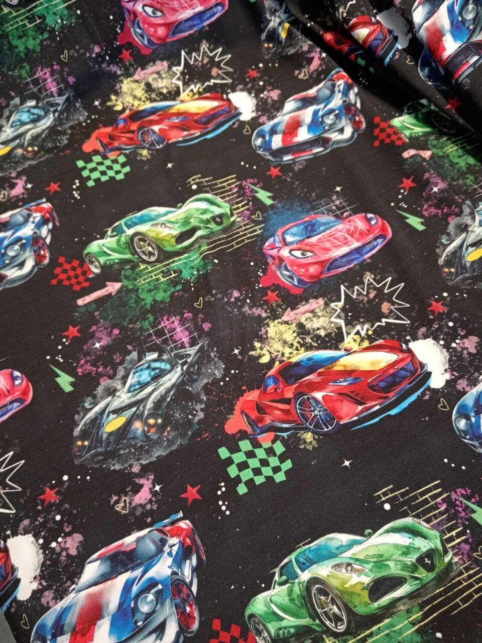 Кулирка с лайкрой "спорткары" ширина 180см, высота 60 см. ткань для футболки, лосин, шорт, платья, сарафана, детской одежды, взрослой одежды