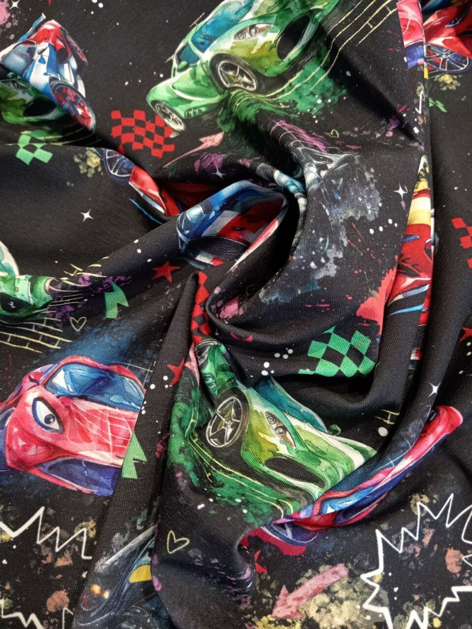Кулирка с лайкрой "спорткары" ширина 180см, высота 80 см. ткань для футболки, лосин, шорт, платья, сарафана, детской одежды, взрослой одежды