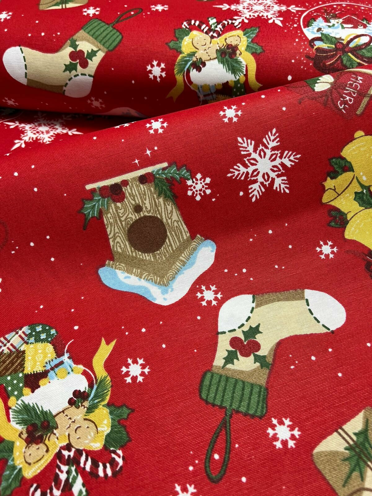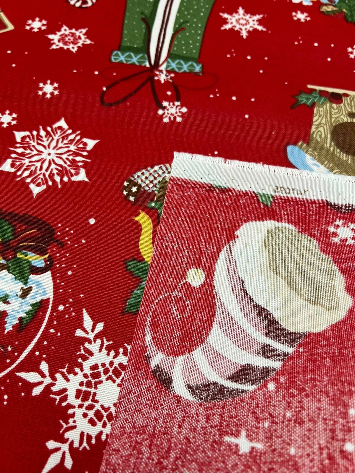 Ткань Дак (DUCK, Панама). 65% хлопок, 35% полиэстер Дак с новогодней тематикой на красном фоне 100х180см интересное: