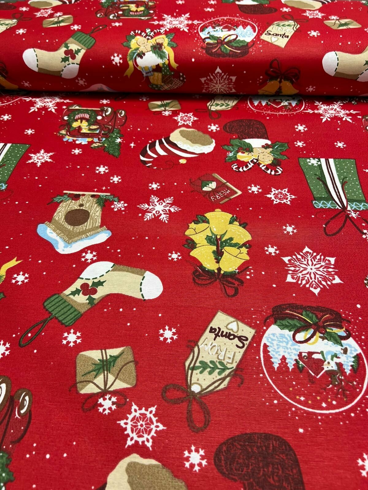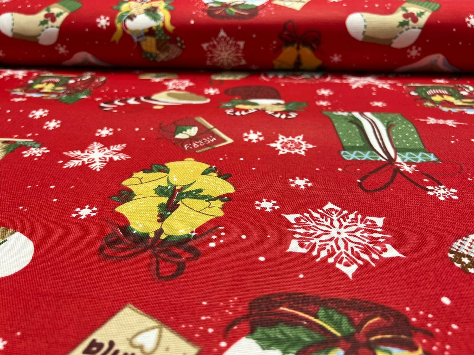Купить Ткань Дак (DUCK, Панама). 65% хлопок, 35% полиэстер Дак с новогодней тематикой на красном фоне 100х180см