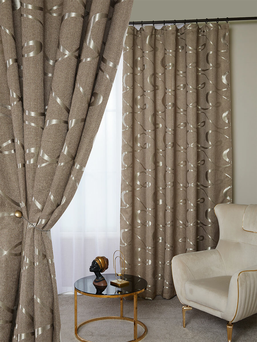 Готовый комплект плотных интерьерных штор(портьер) рогожка с узорным рисунком (2 шт, каждая штора 250x260 см) со шторной лентой