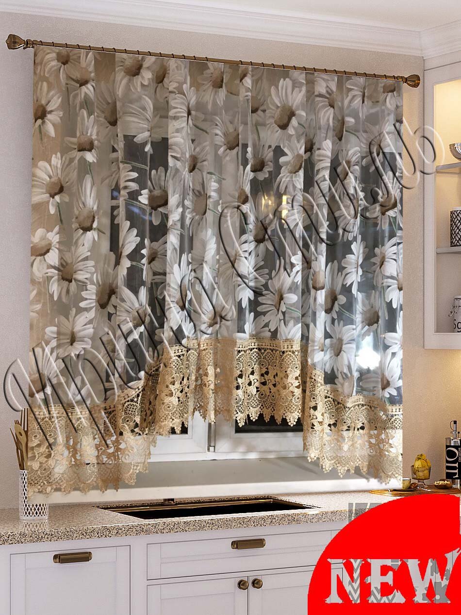 Купить Тюль, шторы для кухни, арка короткая, беж Ромашка 290*160, гардина, занавески в комнату.