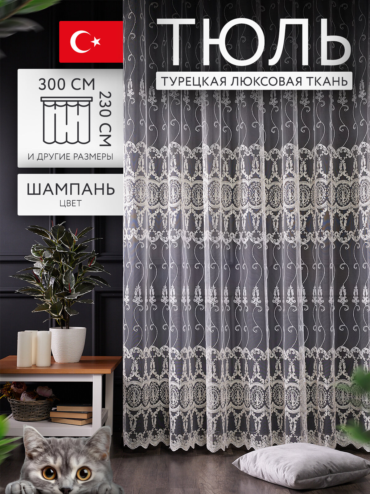 СохранитьТюль сетка 230 см на 300 см с узором на окно для гостиной, спальни, кухни. Прозрачная штора вуаль цвета шампань. интересное: