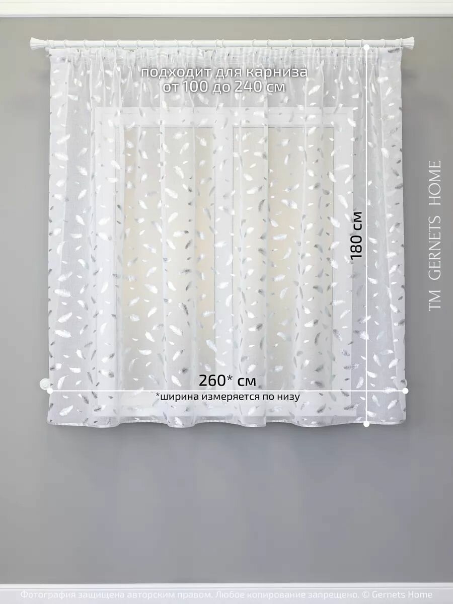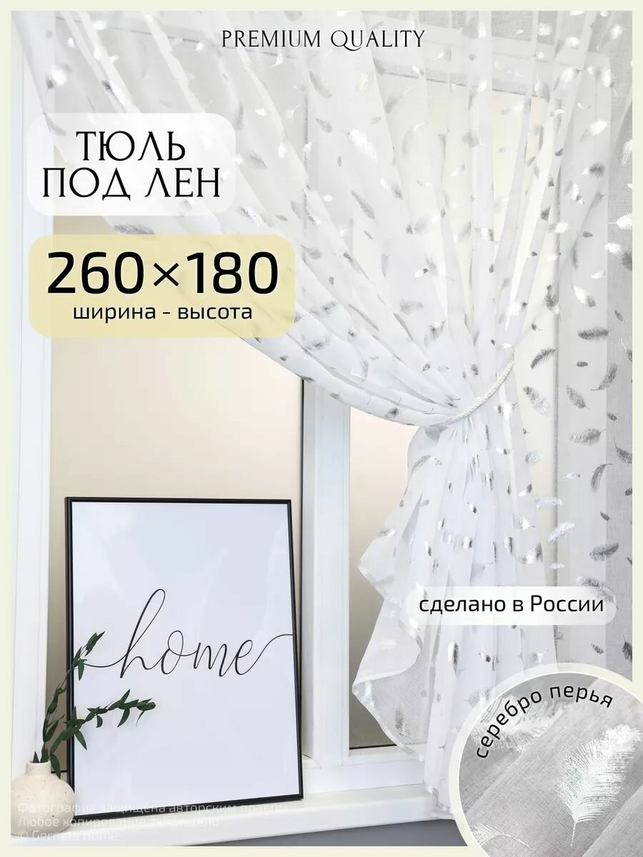 Тюль под лен ширина 260 см высота 160 см на кухню с рисунком "серебро перья" короткая