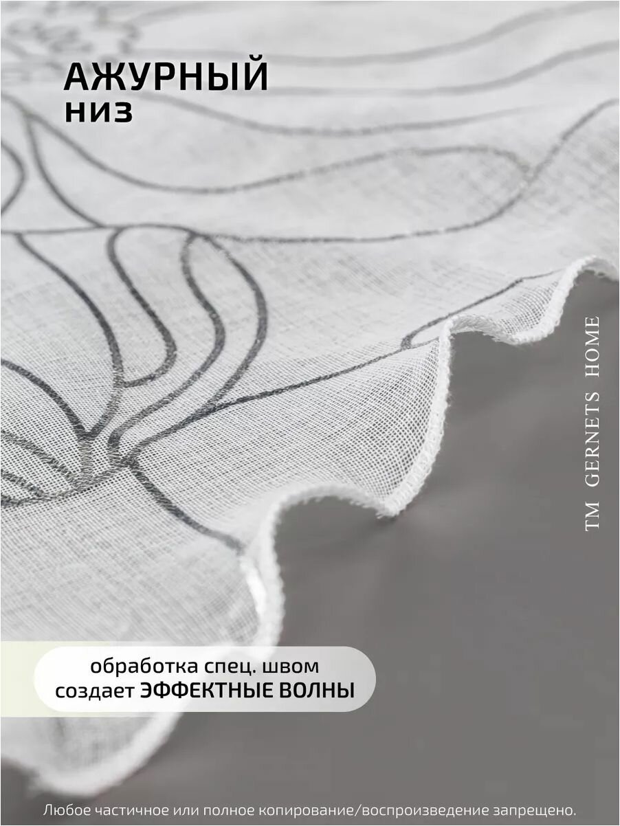 Тюль под лён ширина 260 высота 180 см на кухню с рисунком "серебро георгины" короткая