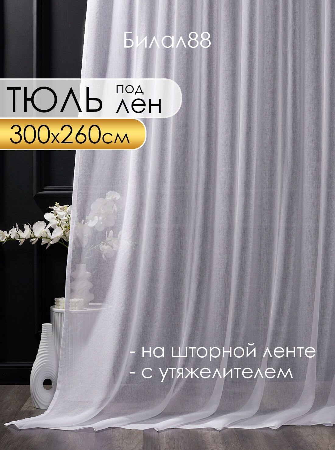 Готовый тюль под лен на шторной ленте с утяжелителем ширина 300 см высота 250 см; вуаль 3 м