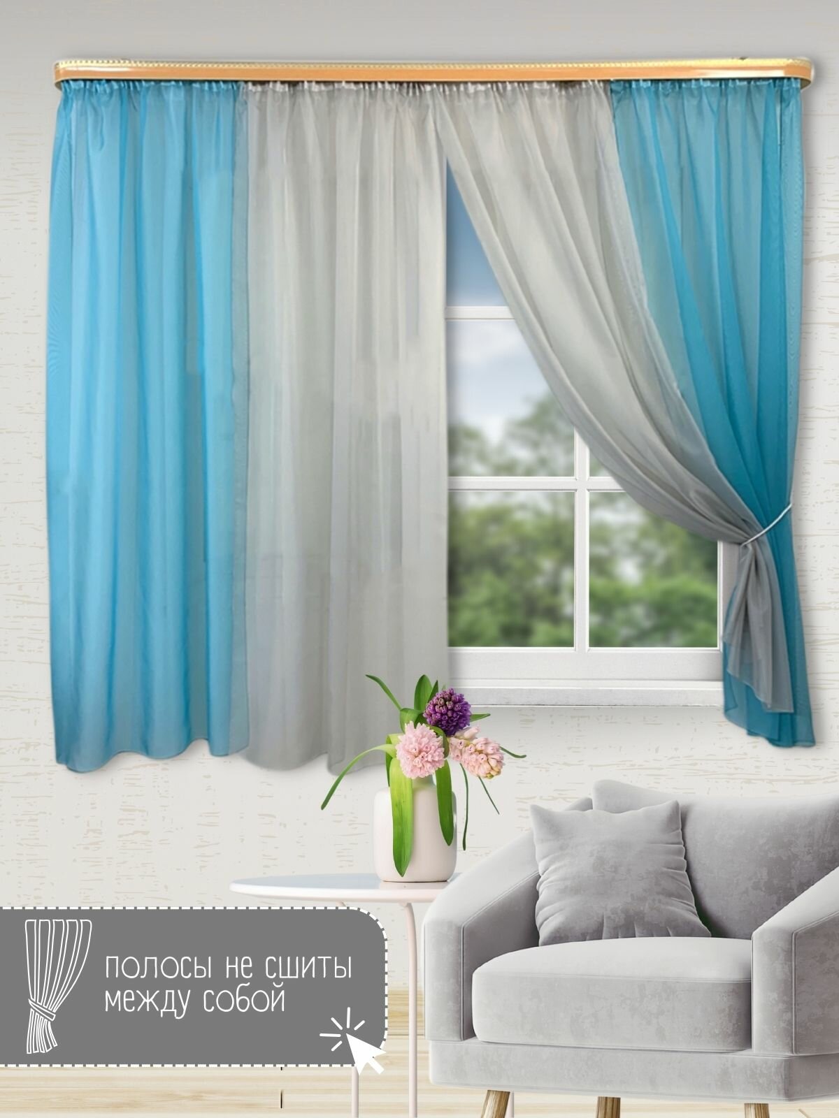 Купить Шторы для кухни короткие тюль вуаль Домтекс35 "Радуга" 380*180см бирюзовый/серый