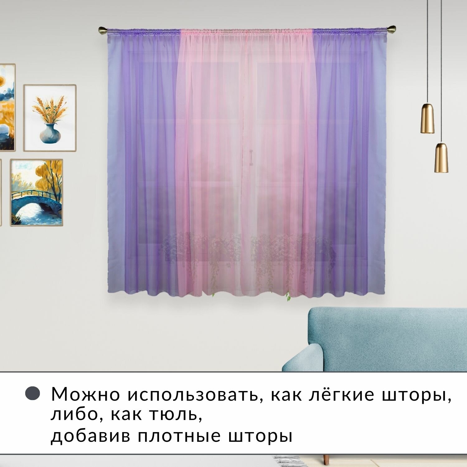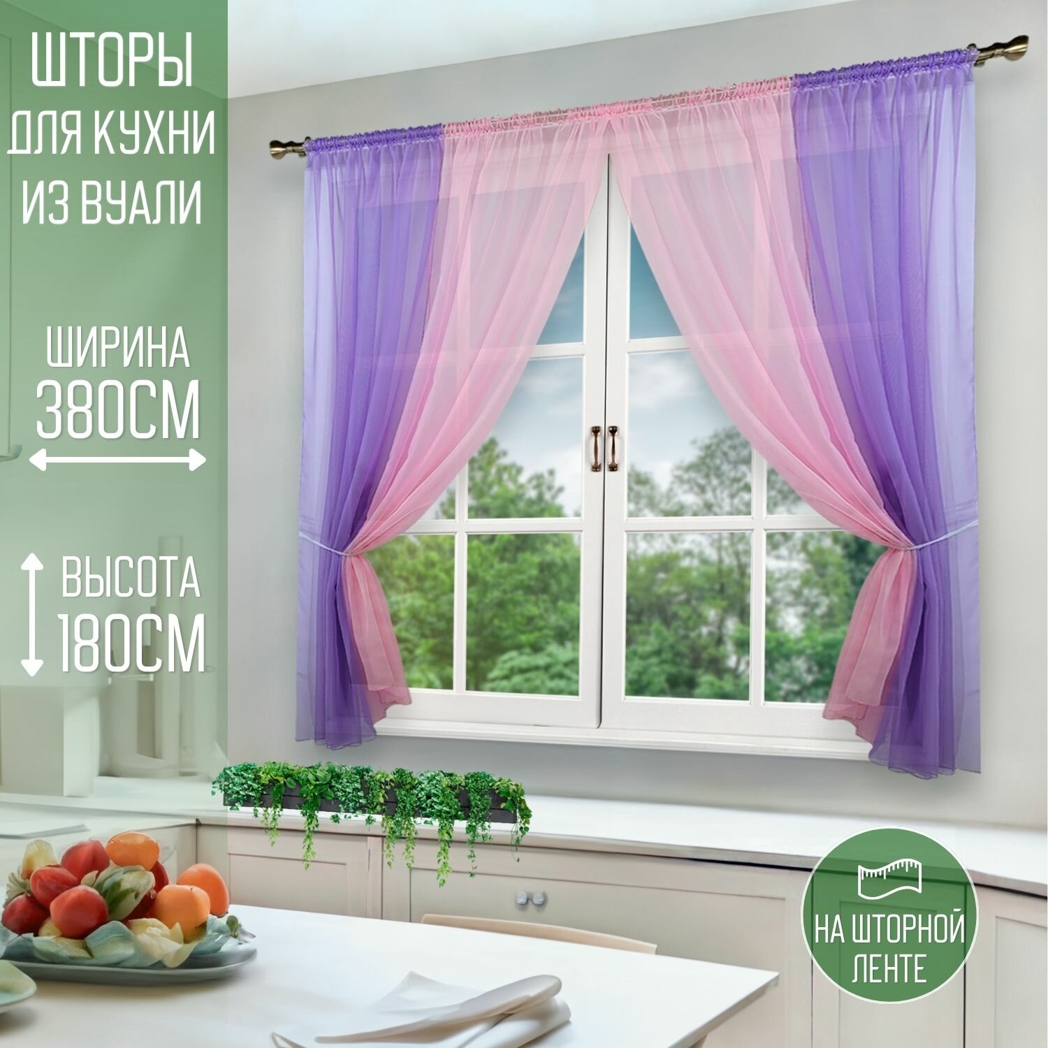 Купить Шторы для кухни короткие тюль вуаль Домтекс35 "Радуга" 380*180см сиреневый/розовый