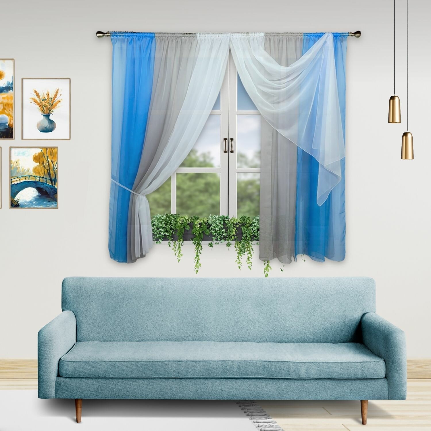 Купить Шторы для кухни короткие тюль вуаль Домтекс35 "Радуга" 580*180см голубой/серый