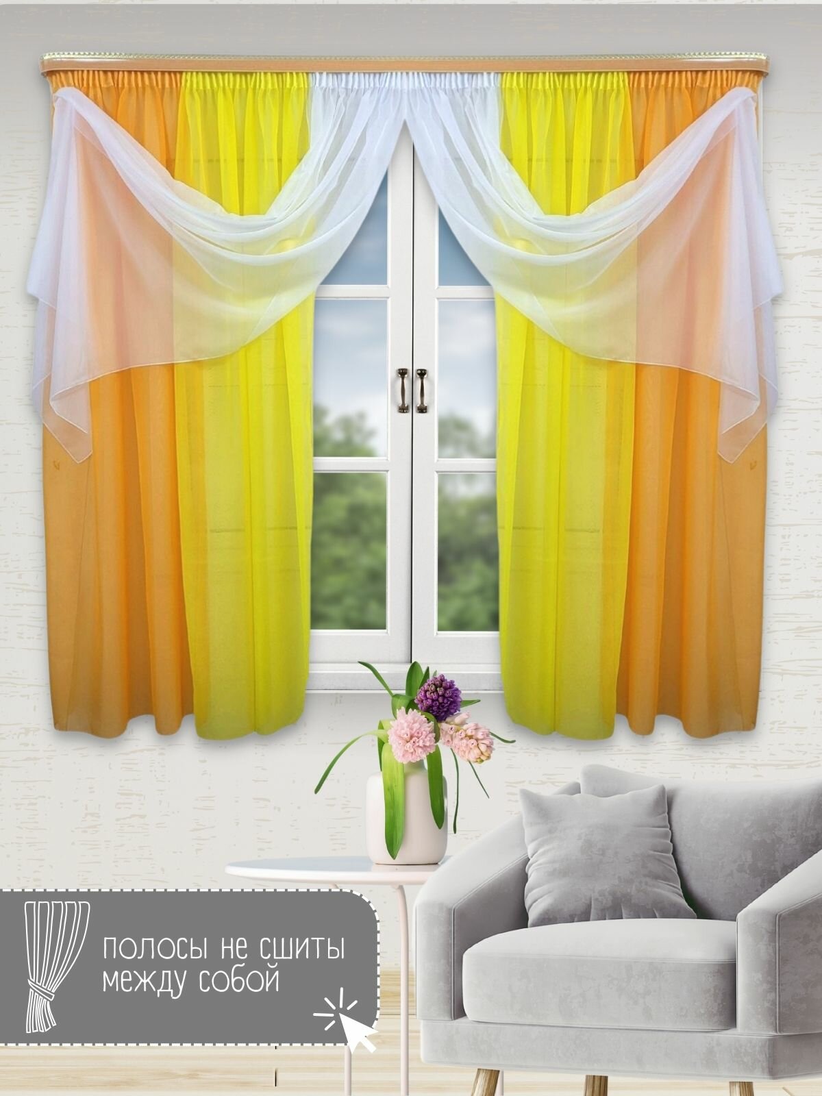 Купить Шторы для кухни короткие тюль вуаль Домтекс35 "Радуга" 580*180см оранжевый/желтый