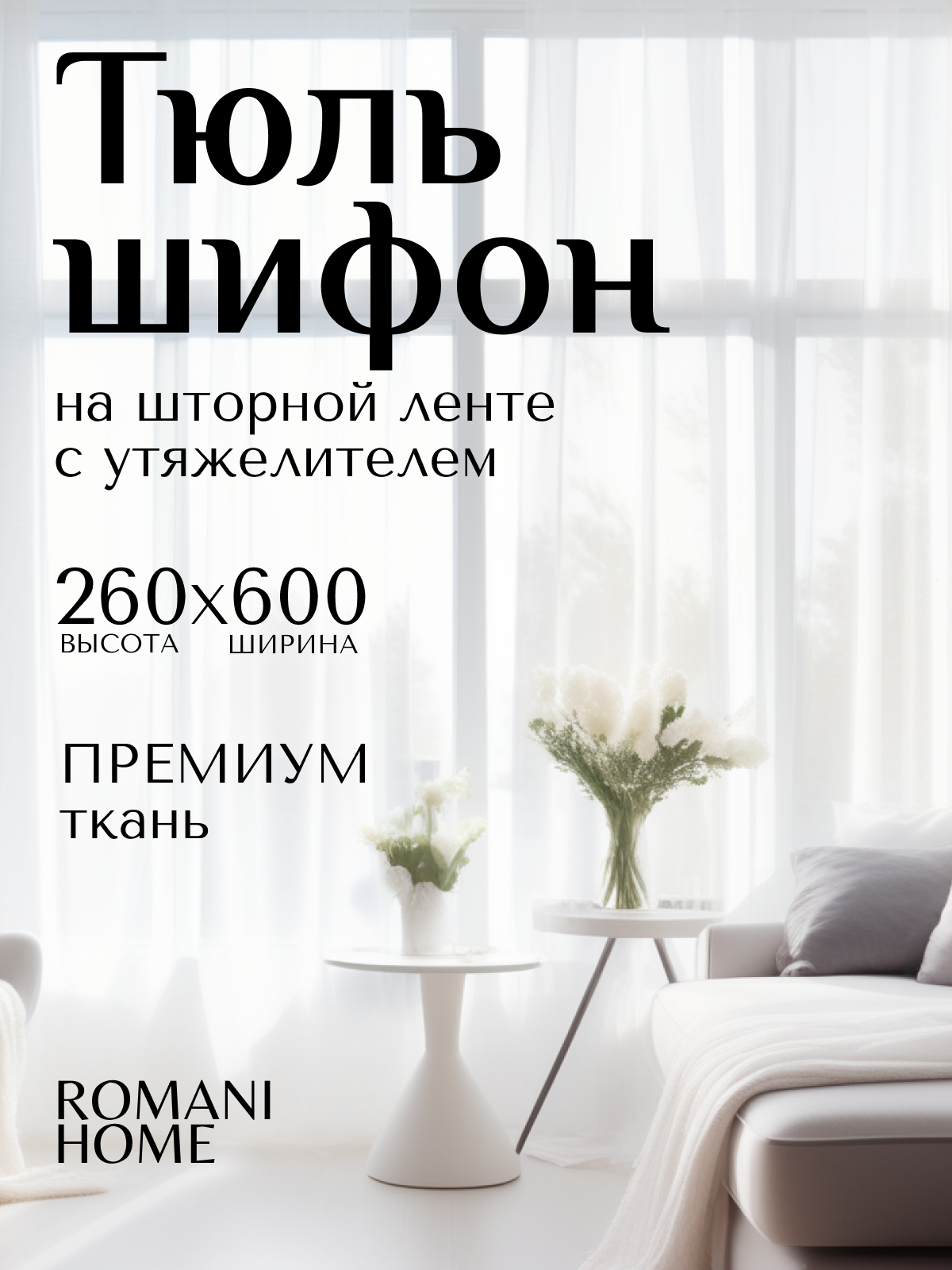 Тюль ROMANI HOME Шифон с утяжелителем, 260x300см, белый, 1 шт