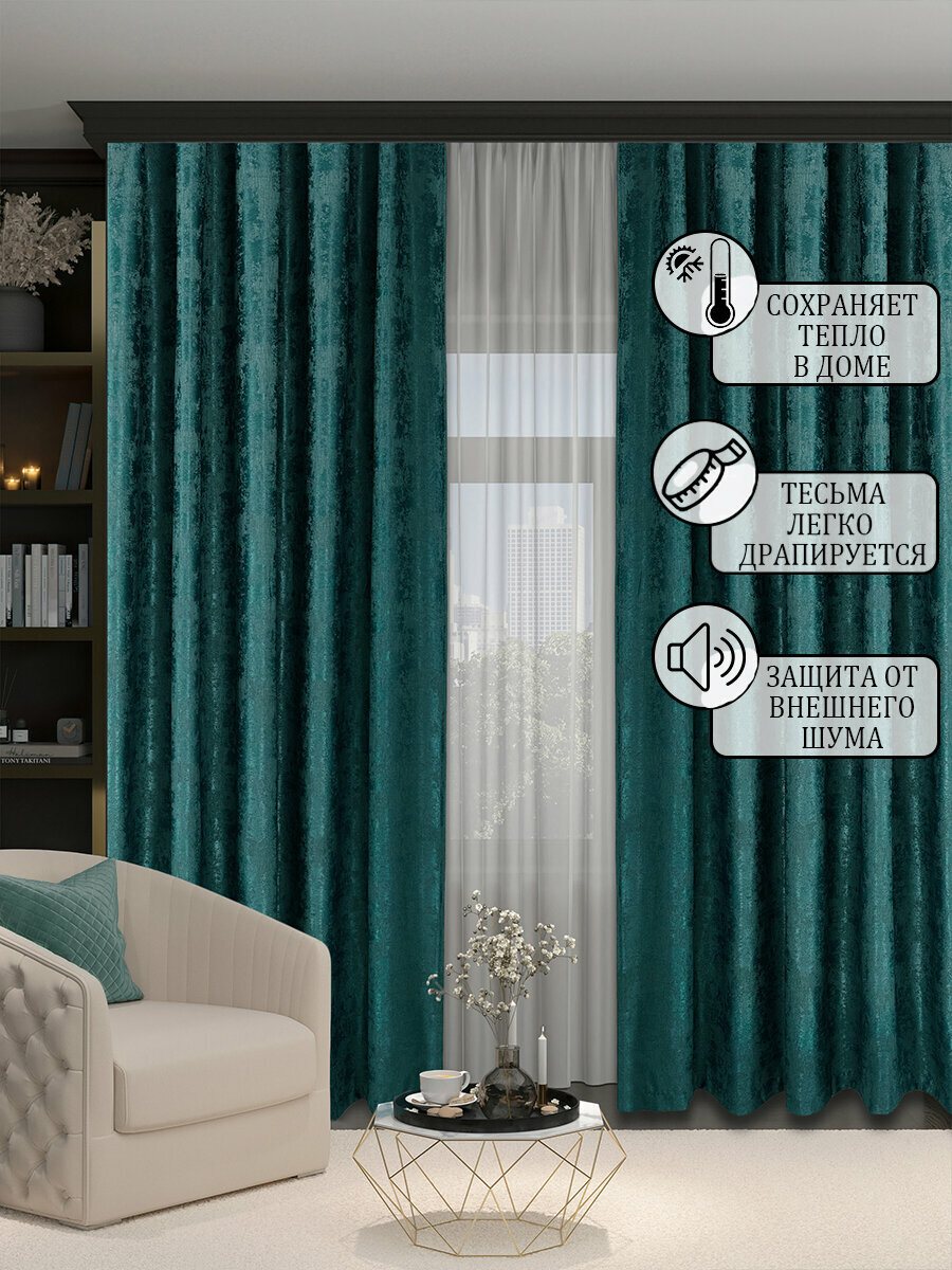 Готовая плотная интерьерная штора(портьера) софт мрамор 150x250 см.(1шт.) темно-бирюзовый