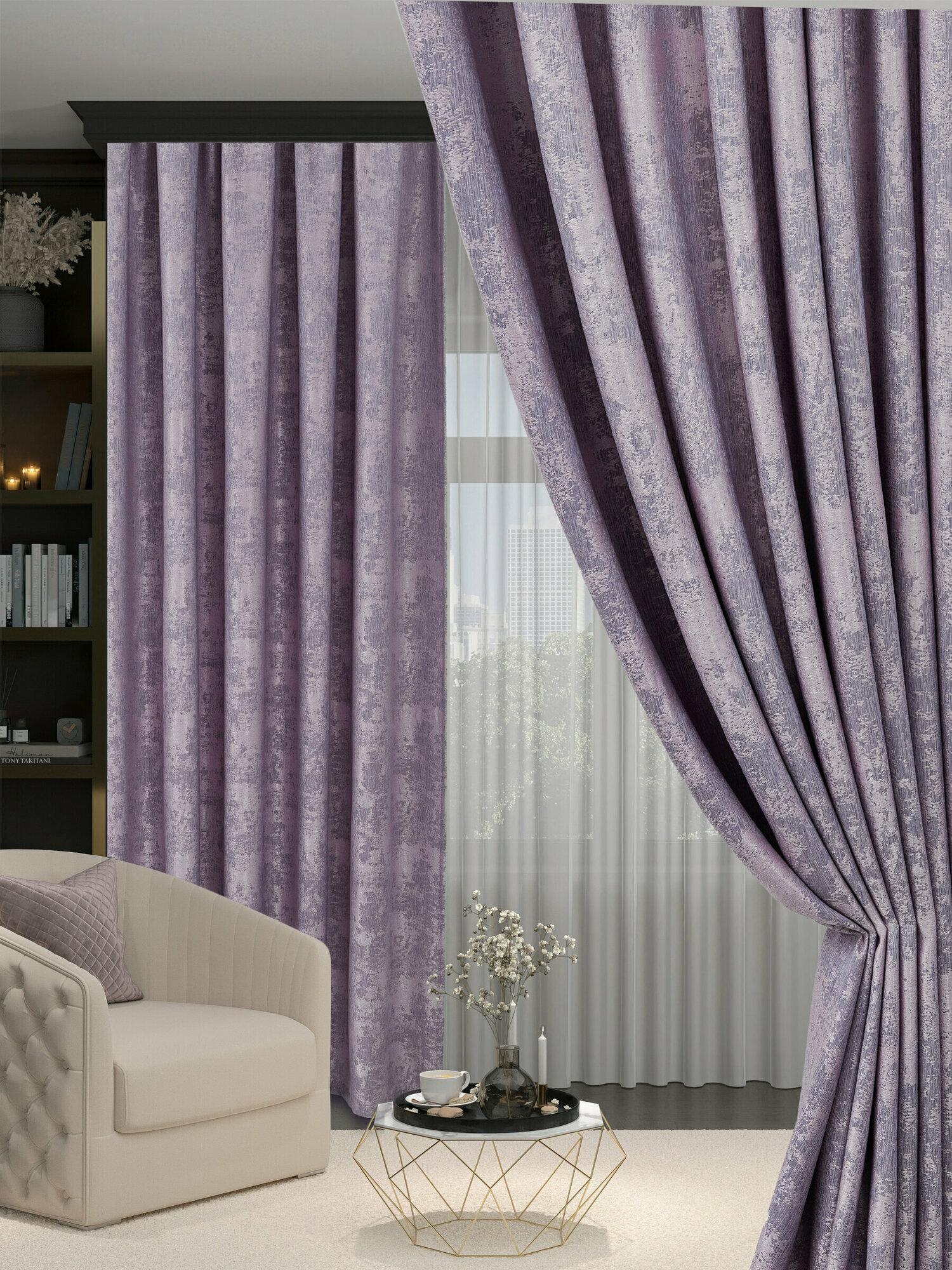 Купить Готовая плотная интерьерная штора(портьера) софт мрамор 250x270 см.(1шт.) сиреневый