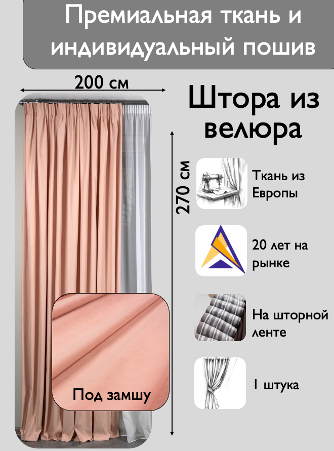 СохранитьШтора 1 шт на шторной ленте / велюр / цвет персиковый / ширина 200 см, высота 270 / в зал, гостиную, спальню, кабинет интересное: