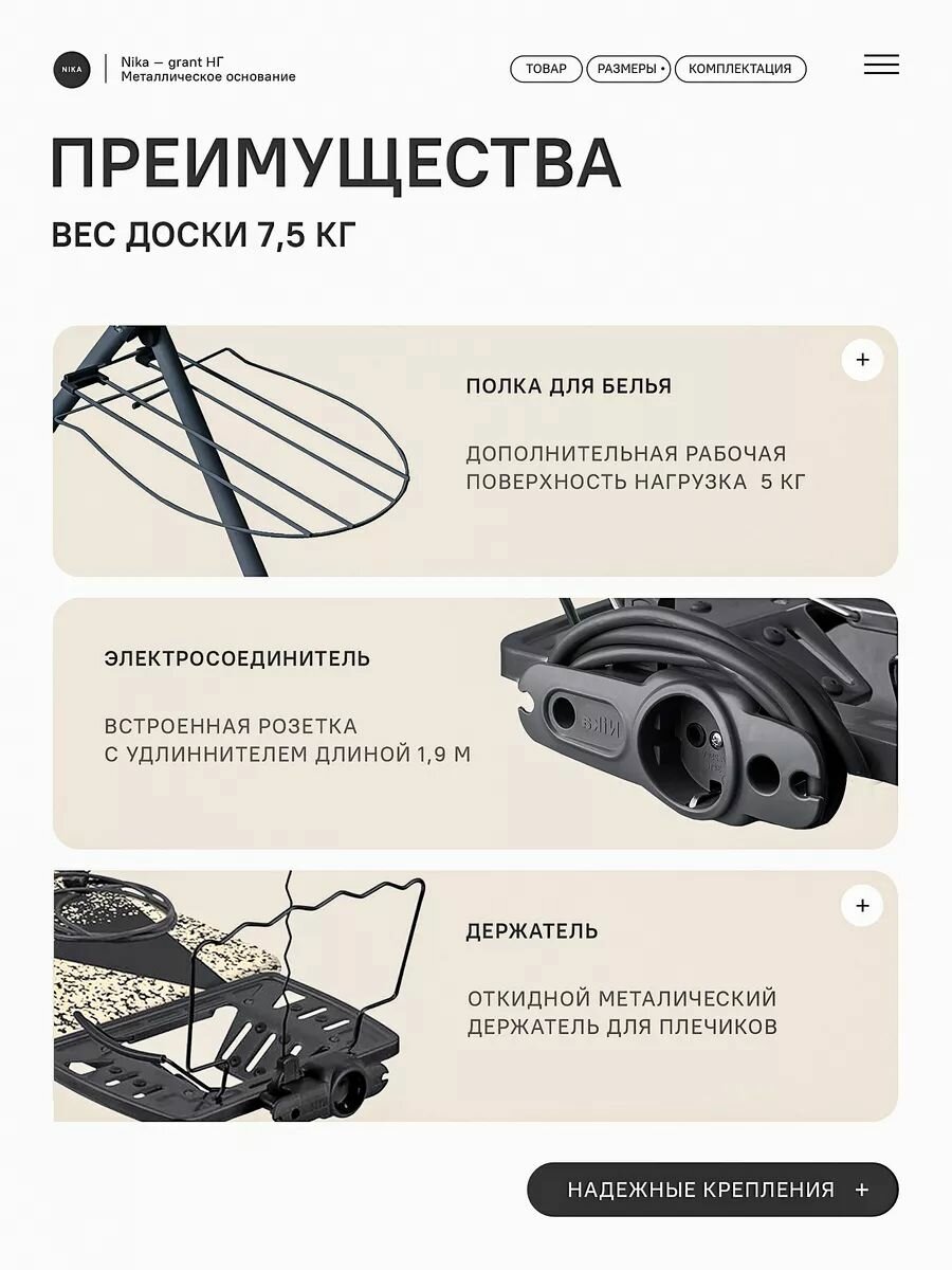 Гладильная доска "Nika Бест", с розеткой, металл, плавная регулировка высоты до 90см