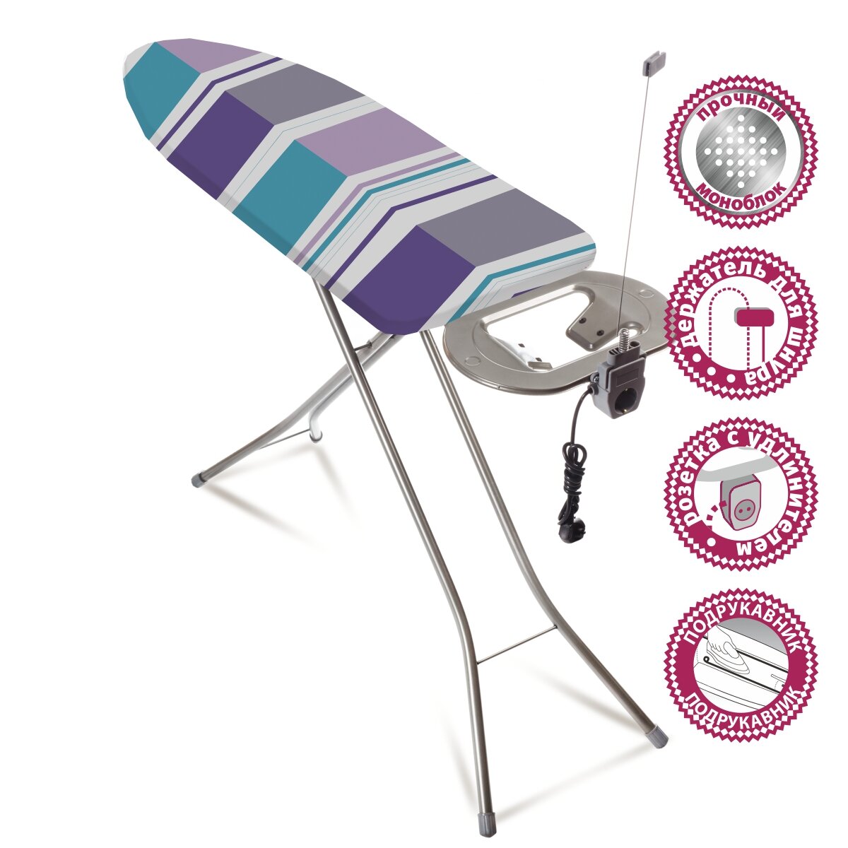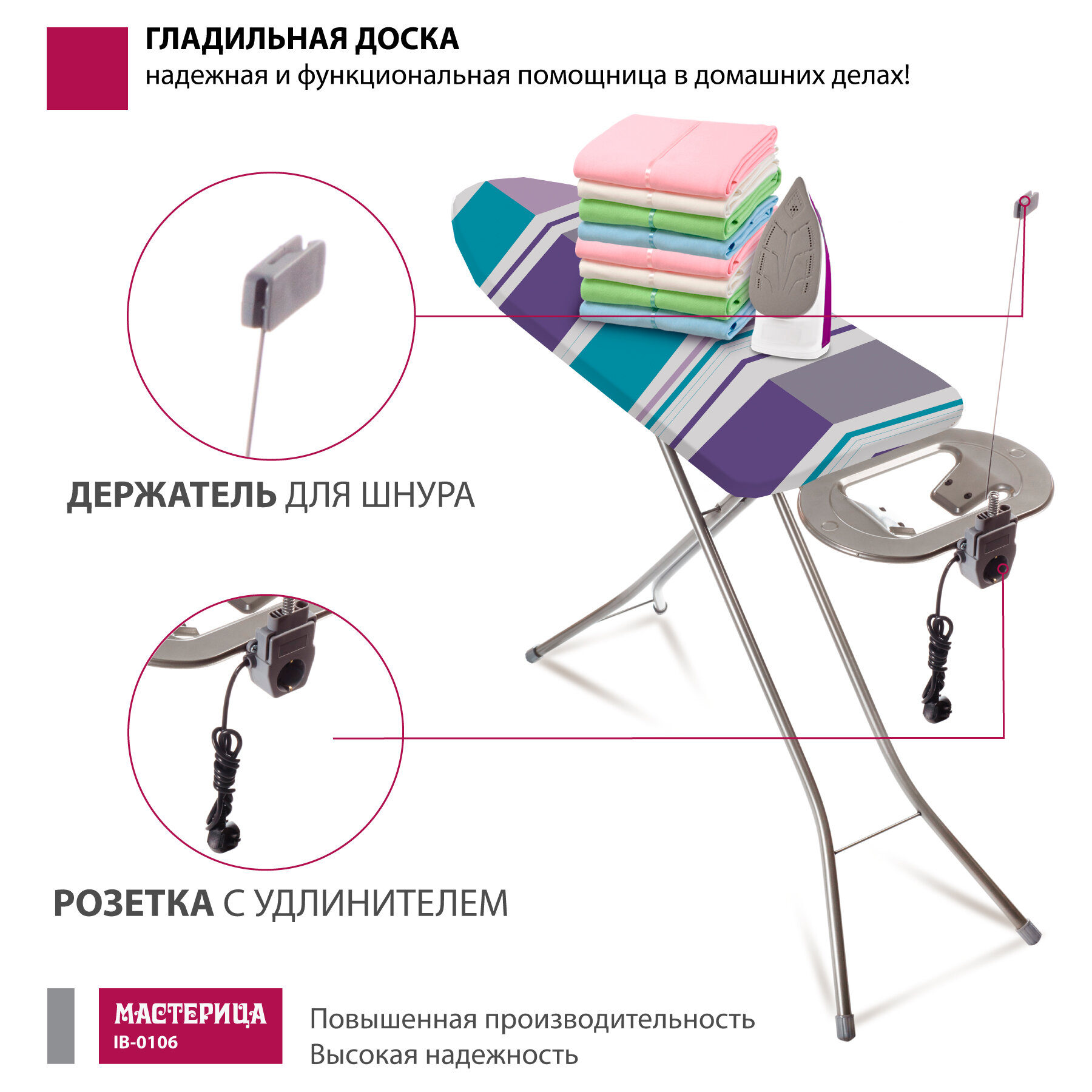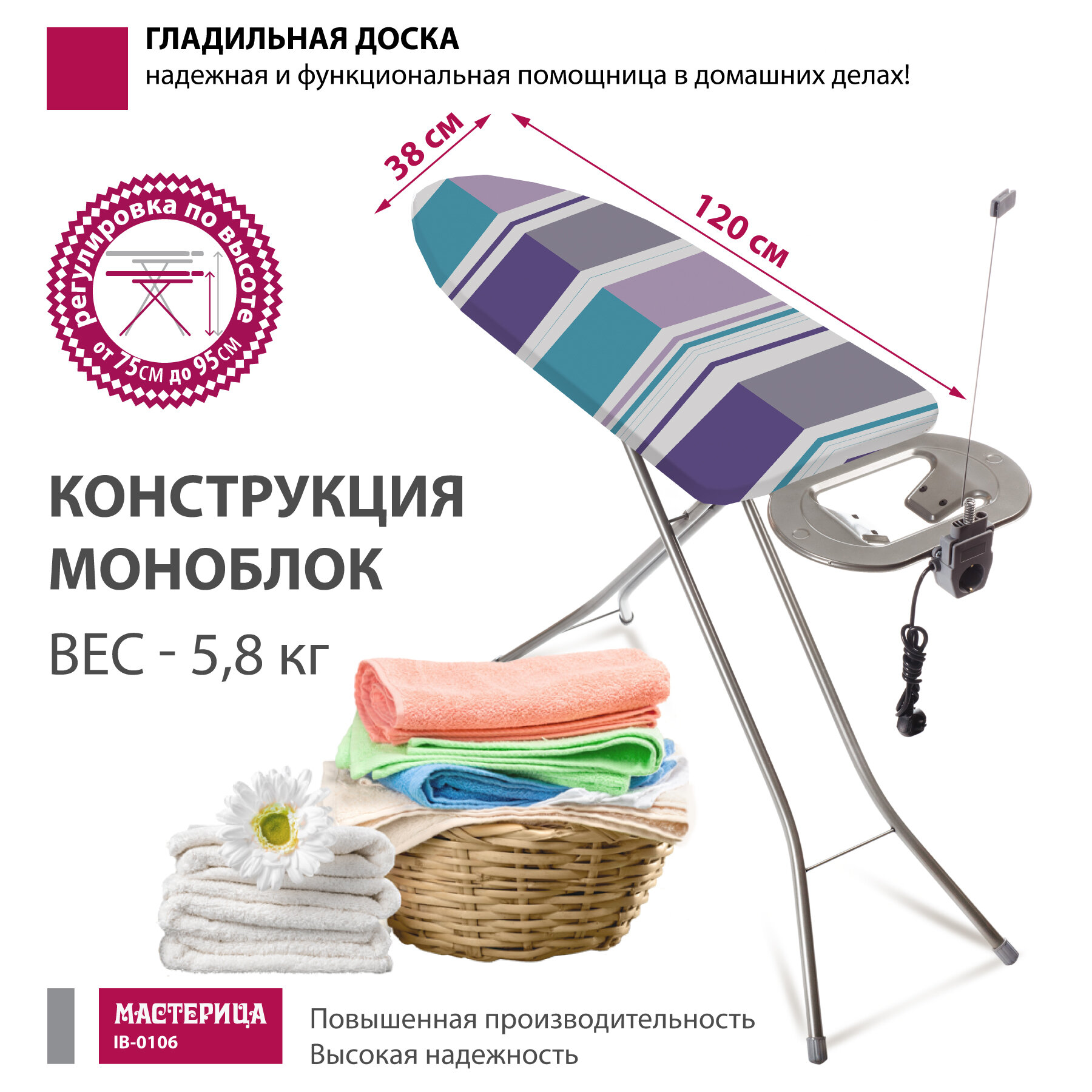 Доска гладильная Мастерица IB-0106, 38*120см, материал: сталь, хлопок, поролон; столешница: метал. моноблок; розетка с удлинит, подрукавник интересное: