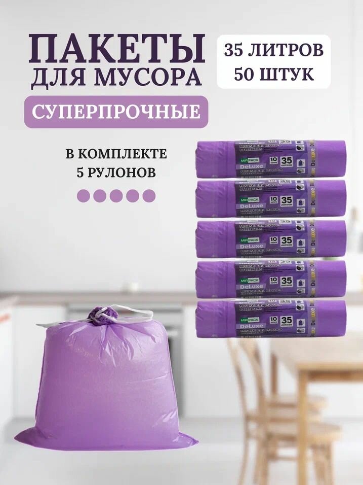 Купить Мешки для Мусора MirPack Deluxe, 35L, особопрочный, 40 мкм, с завязками, сиреневые, фиолетовые