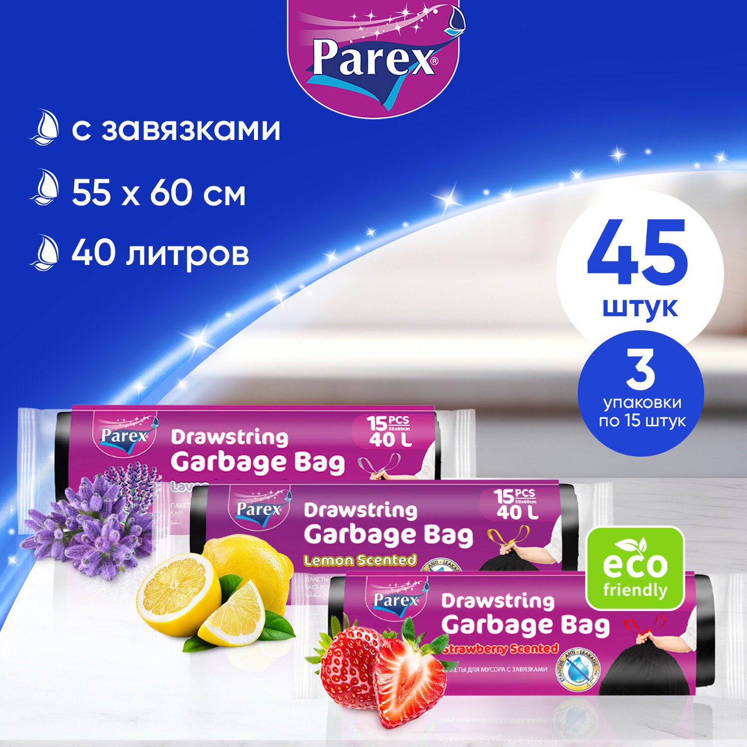 Пакеты для мусора Parex биоразлагаемые с завязками и ароматом, полиэтиленовые 45 шт, 40 литров интересное: