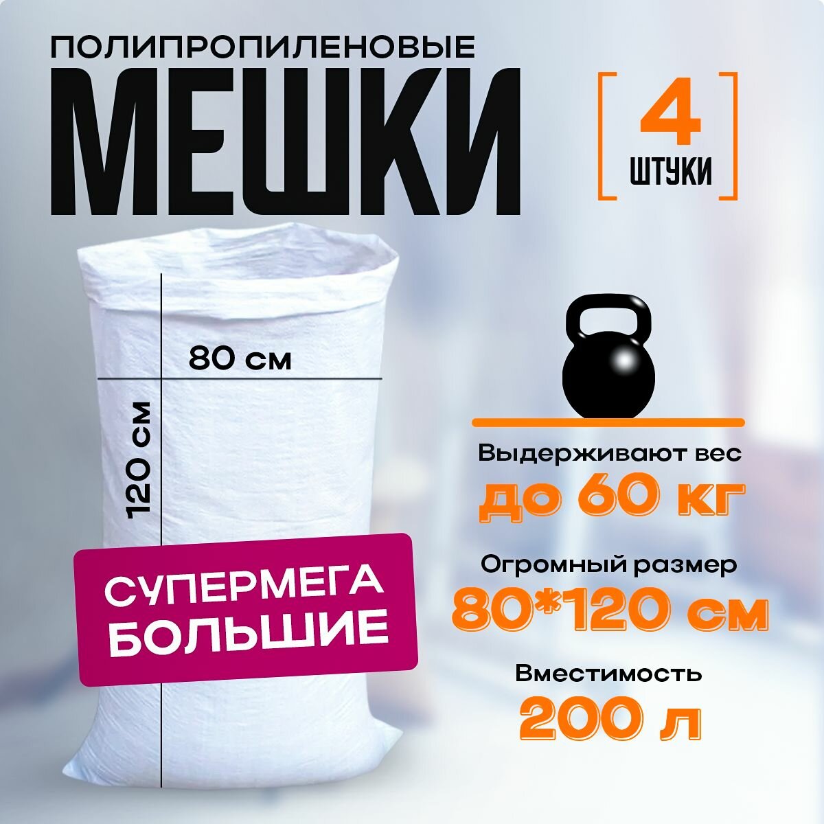Мешки строительные 80х120см, 10шт, 200л, белые, сверхпрочные, полипропилен