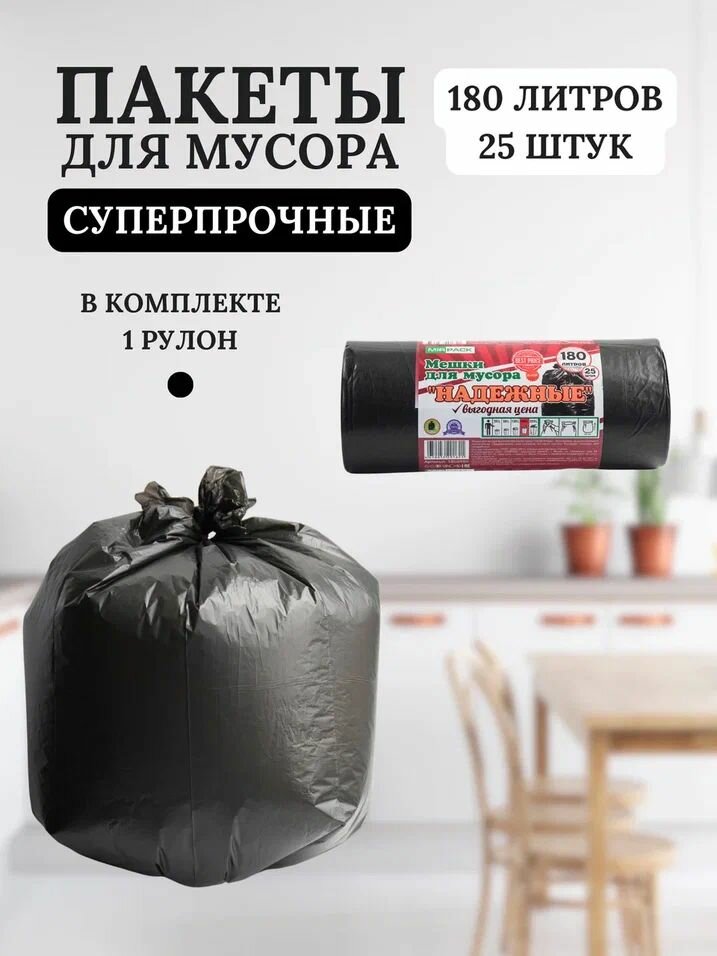 Мешок мусорный 180 литров, сверхпрочный, для строительного мусора, для уборки территории, для уборки после ремонта