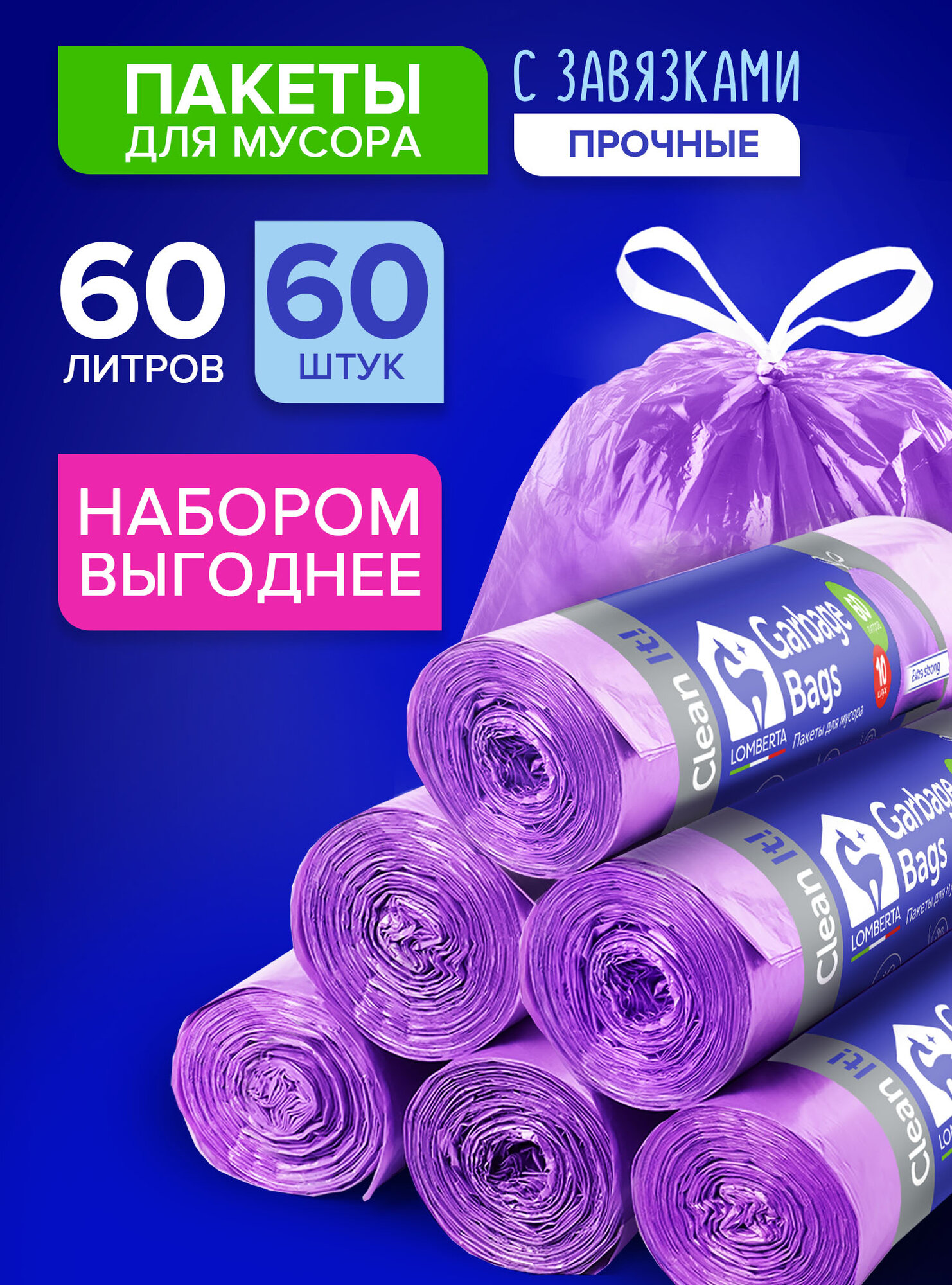 Купить Мешки для мусора Lomberta, 60 литров, 60 шт, с завязками, полиэтиленовые, плотные, в рулоне