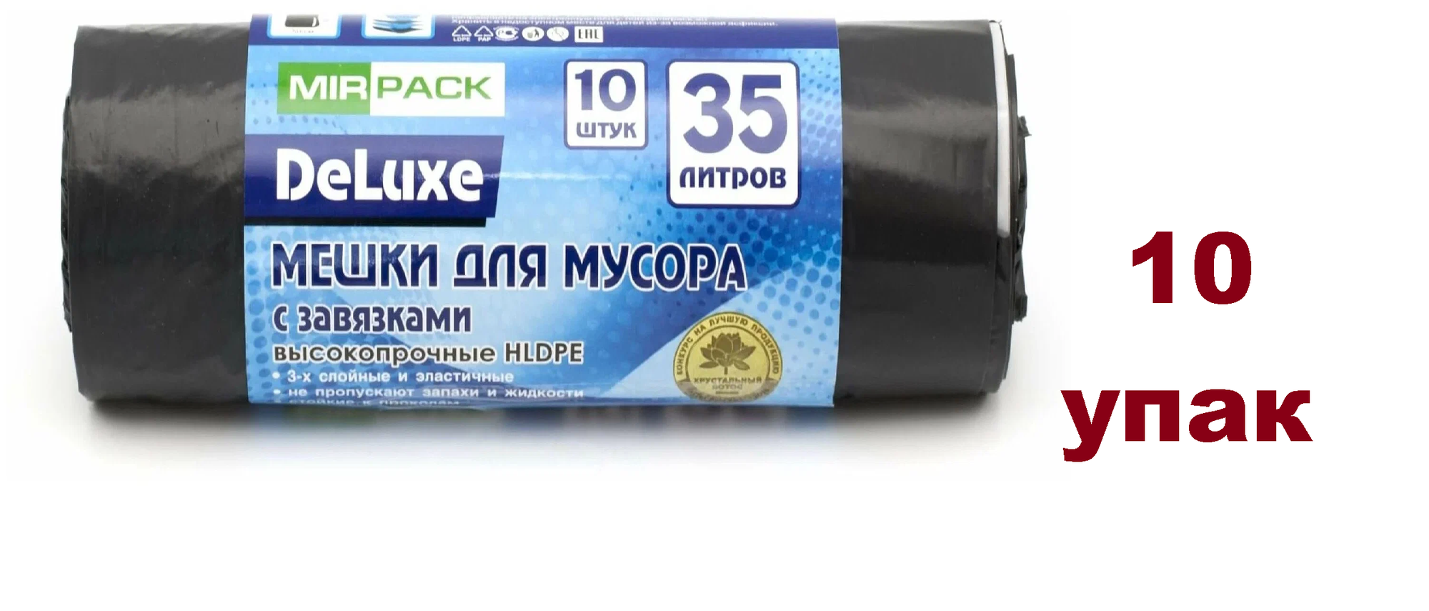 Мешки для мусора MIRPACK Deluxe высокопрочные с завязками 35 л, 10 шт в рулоне, 10 рулонов, черный интересное:
