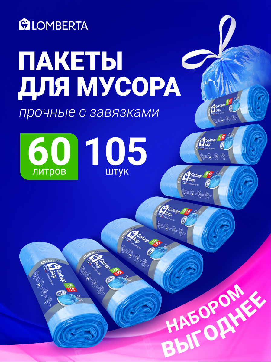 Мешки для мусора Lomberta, прочные с завязками в рулоне, 60 литров, 105 шт интересное: