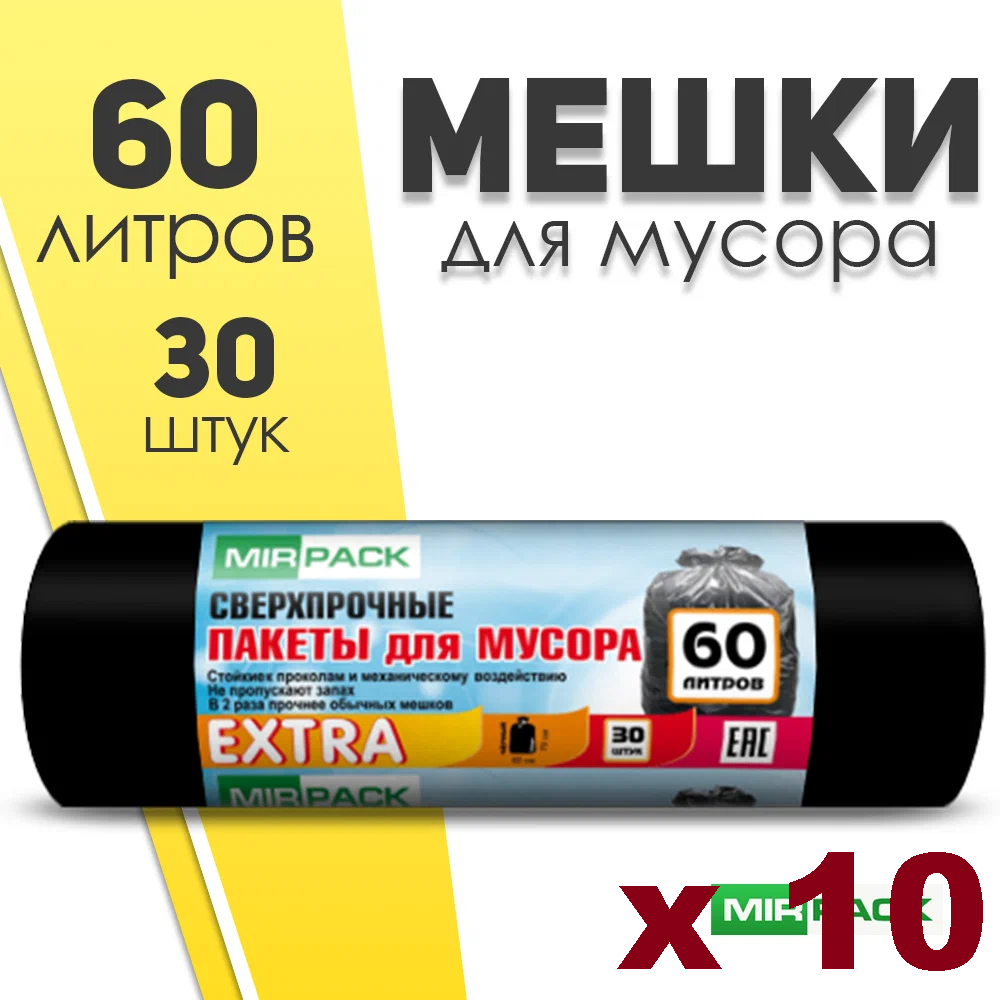 Мешки для мусора MIRPACK Extra сверхпрочные 60 л, 30 шт, черный, 10 упак интересное: