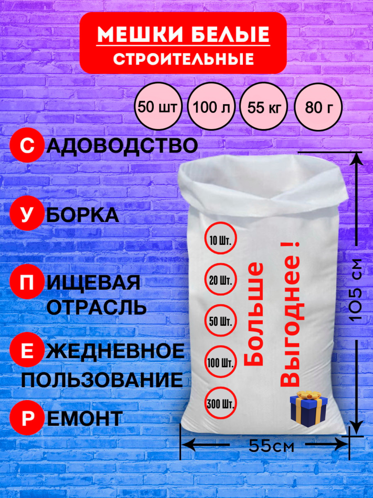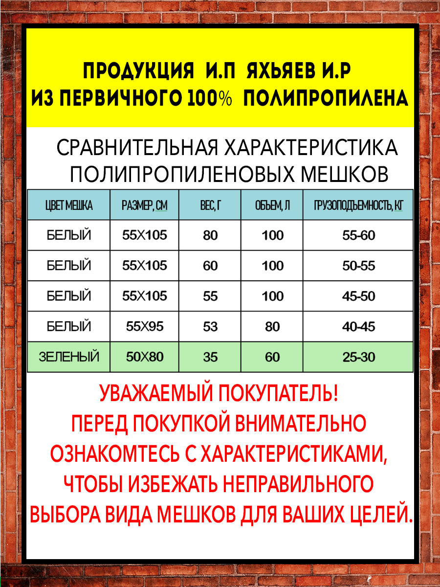 Мешки для строительного мусора полипропиленовые белые, большие, плотные, для переезда, прочные 57*105 см, 50шт, 100л, 50кг, 62гр/м интересное: