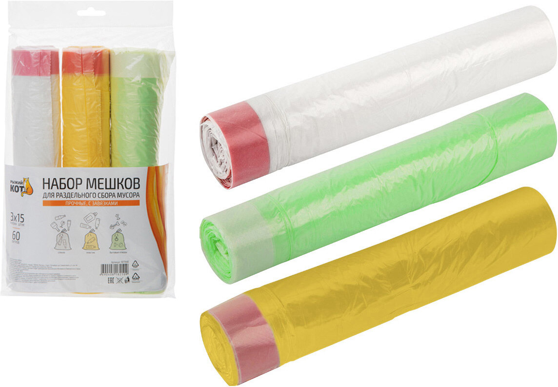 Ниже Вы можете прочитать отзывы на Набор мешков для раздельного сбора мусора "Рыжий Кот", 60 л, 3 рулона по 15 шт., ознакомится с подробными характеристиками, посмотреть интересные обзоры и фотографии на Набор мешков для раздельного сбора мусора "Рыжий Кот", 60 л, 3 рулона по 15 шт..