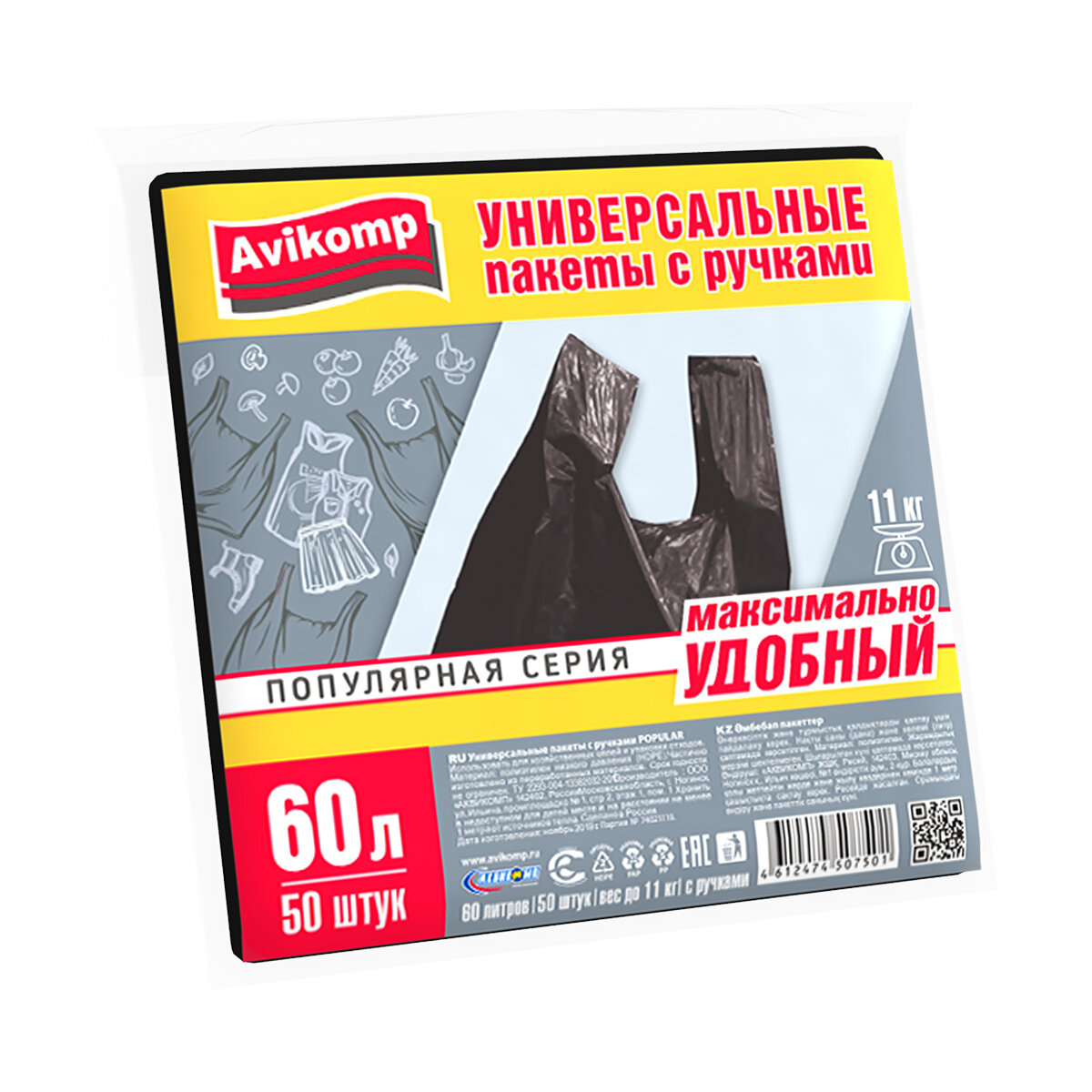 Купить Пакеты универсальные с ручками "popular" 60 л, упак. 50 шт. (черные) "Avikomp"