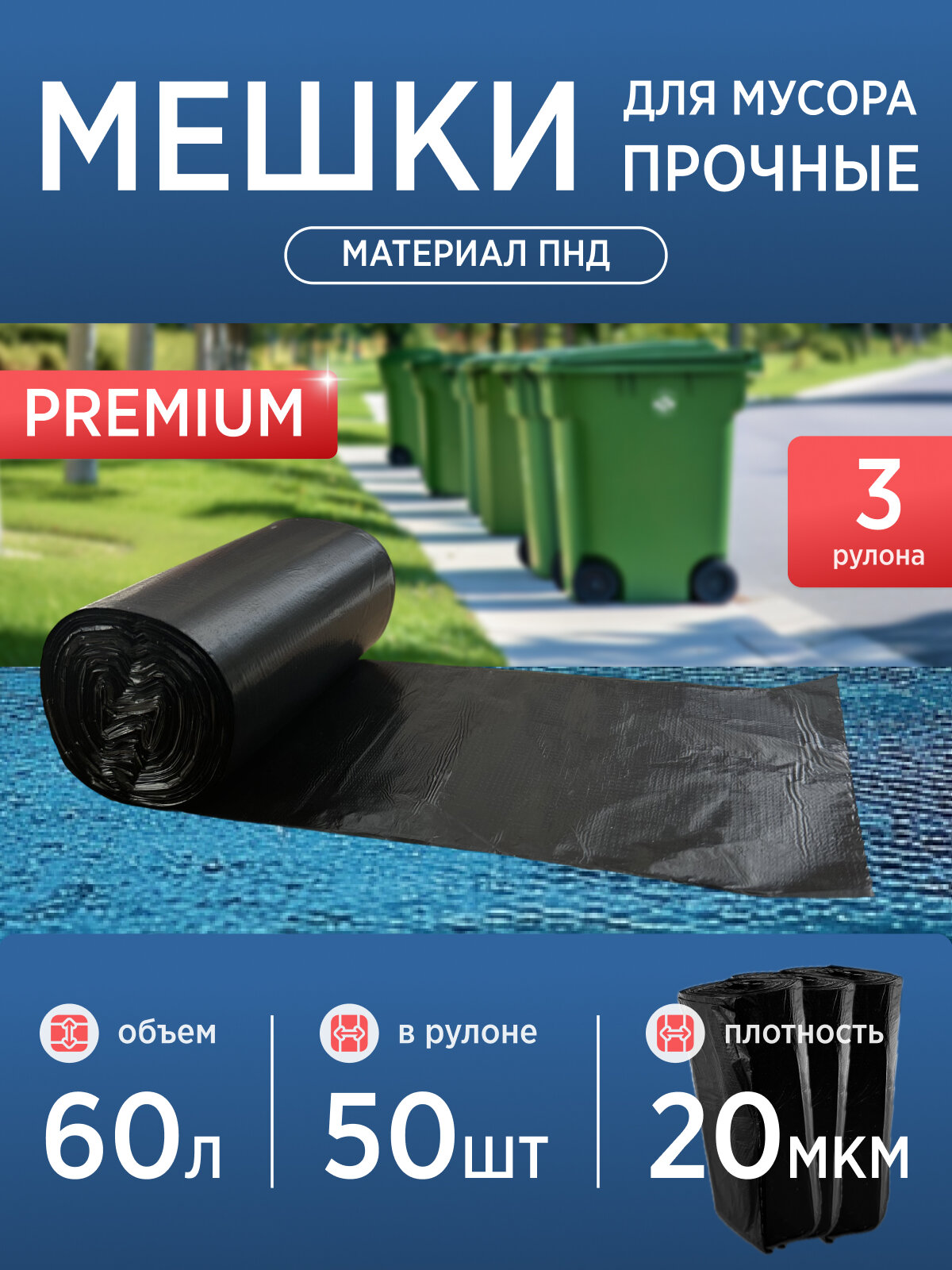 Купить Пакеты для мусора 60л. Премиум прочные 3 рулона по 50шт. 20мкм.