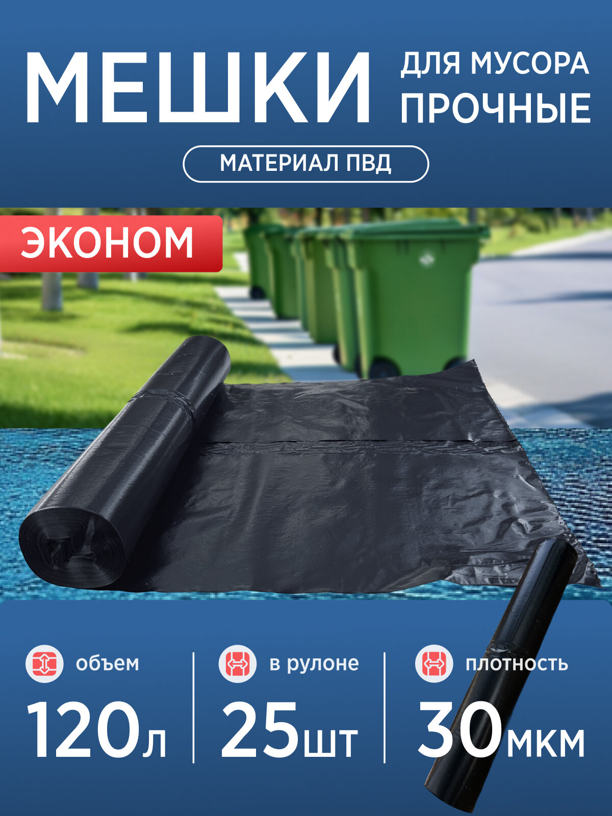 Ниже Вы можете прочитать отзывы на Пакеты для мусора 120л. ПВД прочные 5 рулонов по 25шт. 30мкм., ознакомится с подробными характеристиками, посмотреть интересные обзоры и фотографии на Пакеты для мусора 120л. ПВД прочные 5 рулонов по 25шт. 30мкм..