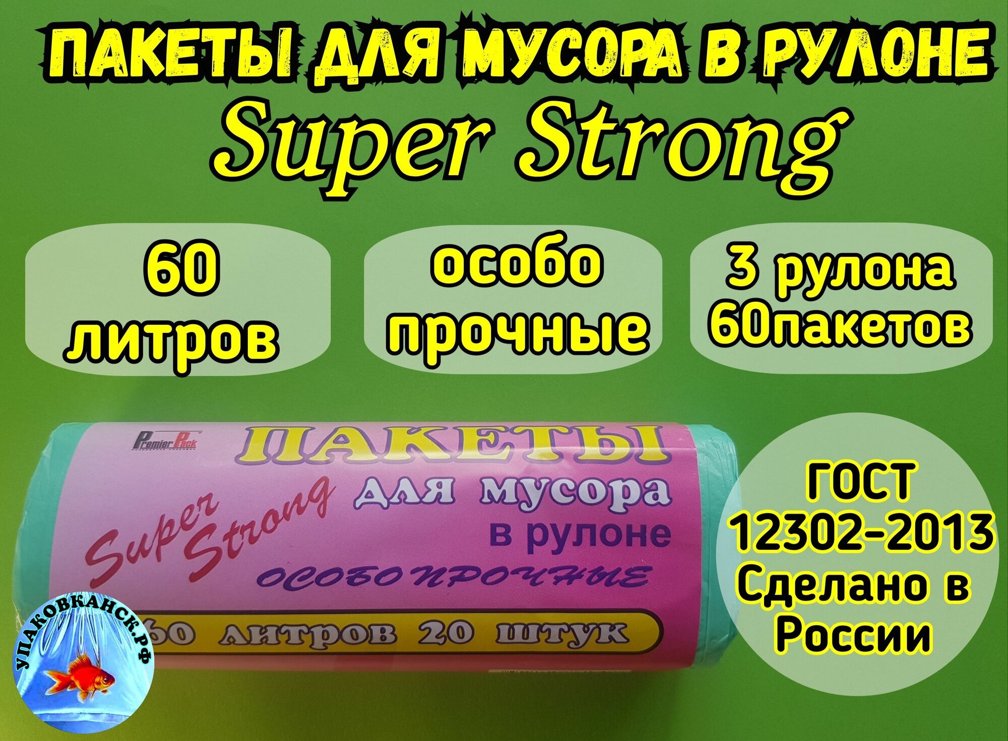 Купить Пакеты для мусора "Super Strong" 60 литров, в рулоне 20 штук, зелёные (3 рулона-60 пакетов)