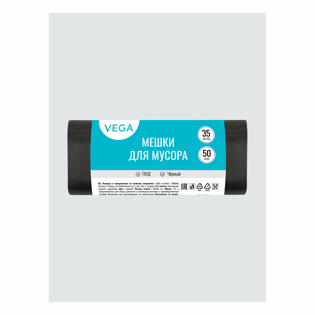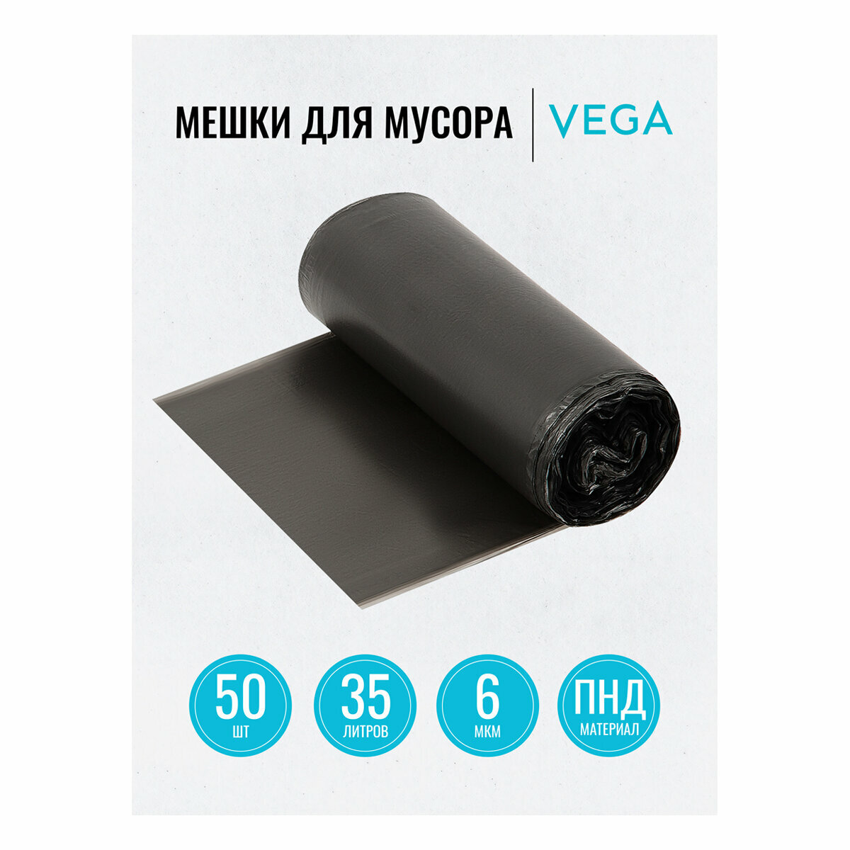 Купить Мешки для мусора 35л Vega ПНД, 50*60см, 6мкм, 50шт, черные, в рулоне, 3 штуки