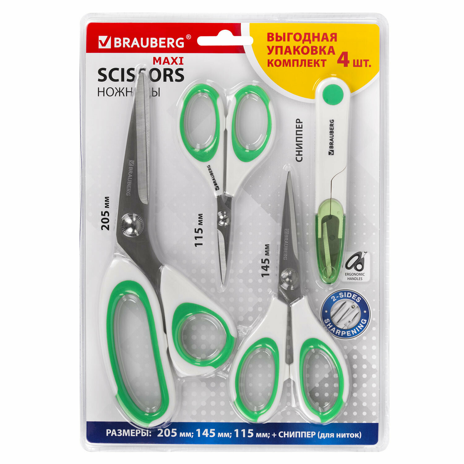 СохранитьНожницы канцелярские универсальные, сниппер для ниток набор 4 шт, для бумаги и картона, для школы и офиса, бело-зеленые ручки, Brauberg Maxi, 272982 интересное: