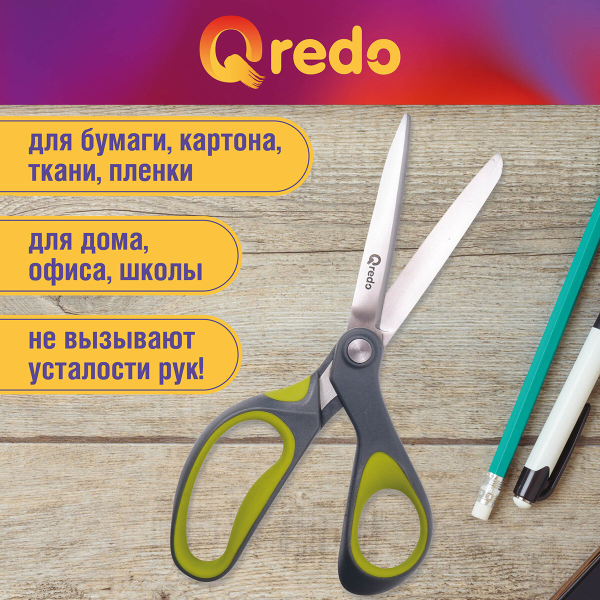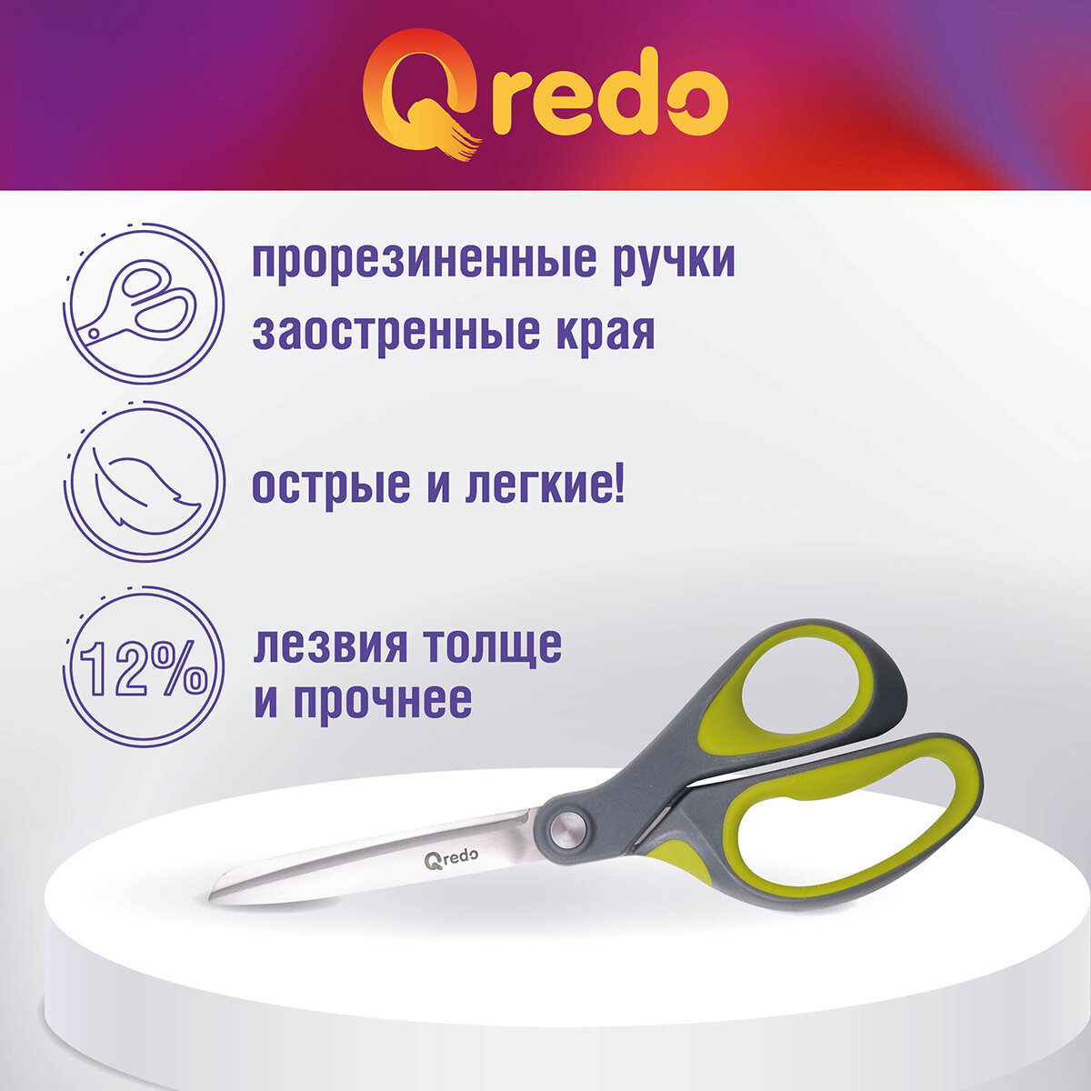 Ножницы 17,8 см QREDO ADAMANT 3D лезвие, эргономичные ручки, серый/зеленый, пластик, прорезиненные интересное: