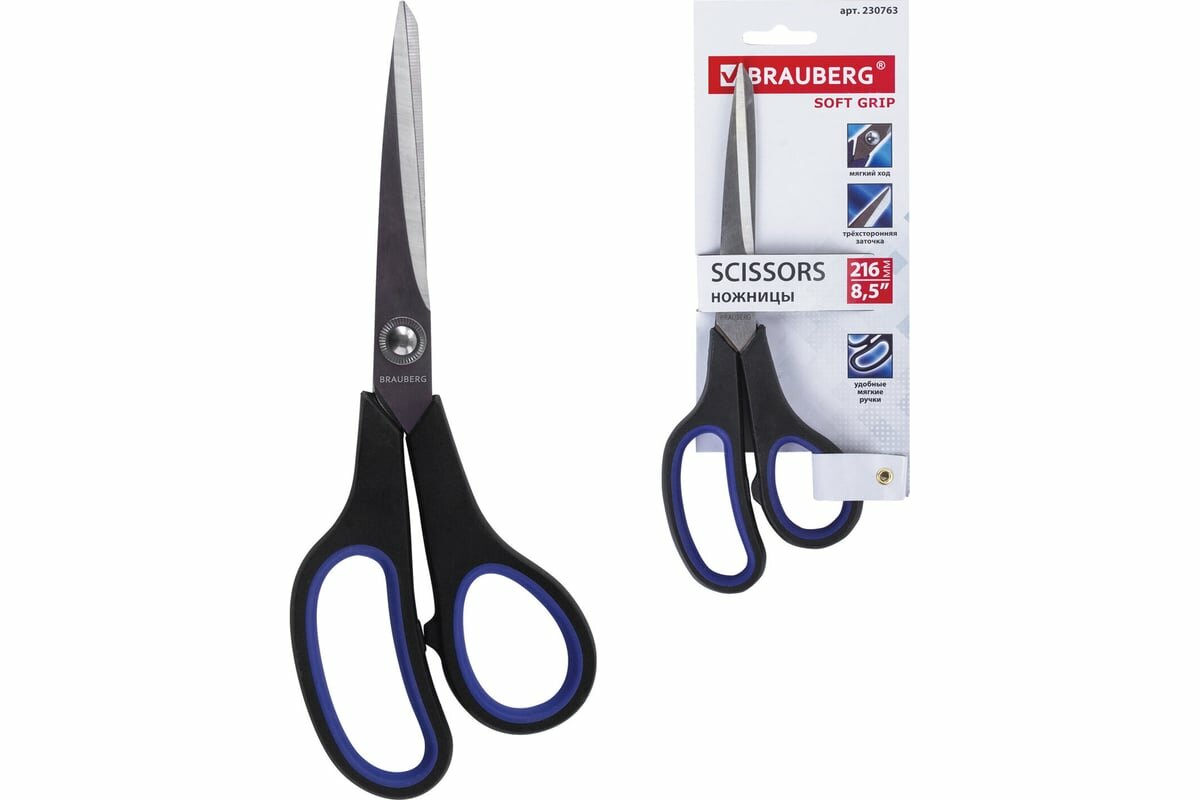 Купить BRAUBERG Ножницы "Soft Grip", 216 мм, резиновые вставки, серо-зеленые, 3-х сторонняя заточка, карт. уп 230763
