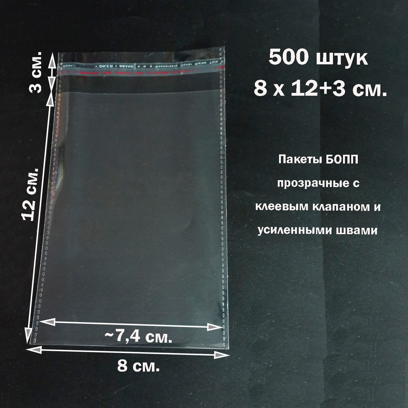 Купить 500 пакетов 8х12+3 см (внутр. размер 7,4х12 см) прозрачных упаковочных с клеевым клапаном и усиленными швами