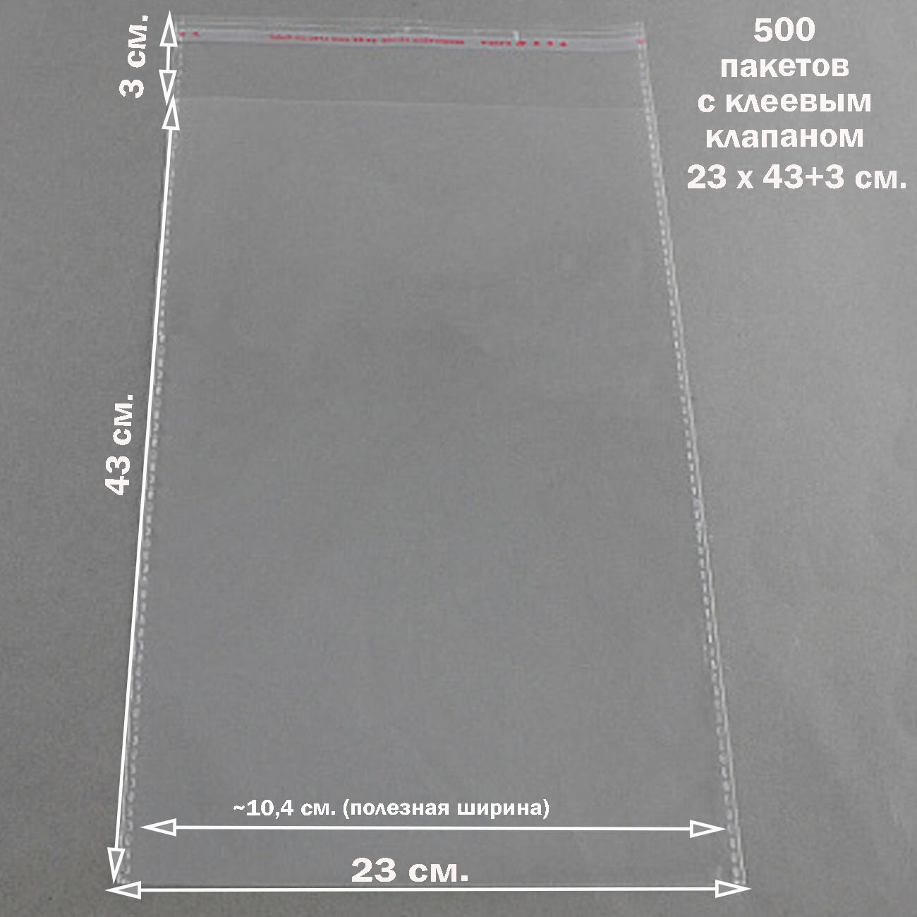 500 пакетов 12х23+3 см (внутр. размер 11,4х23 см) прозрачных упаковочных с клеевым клапаном и усиленными швами