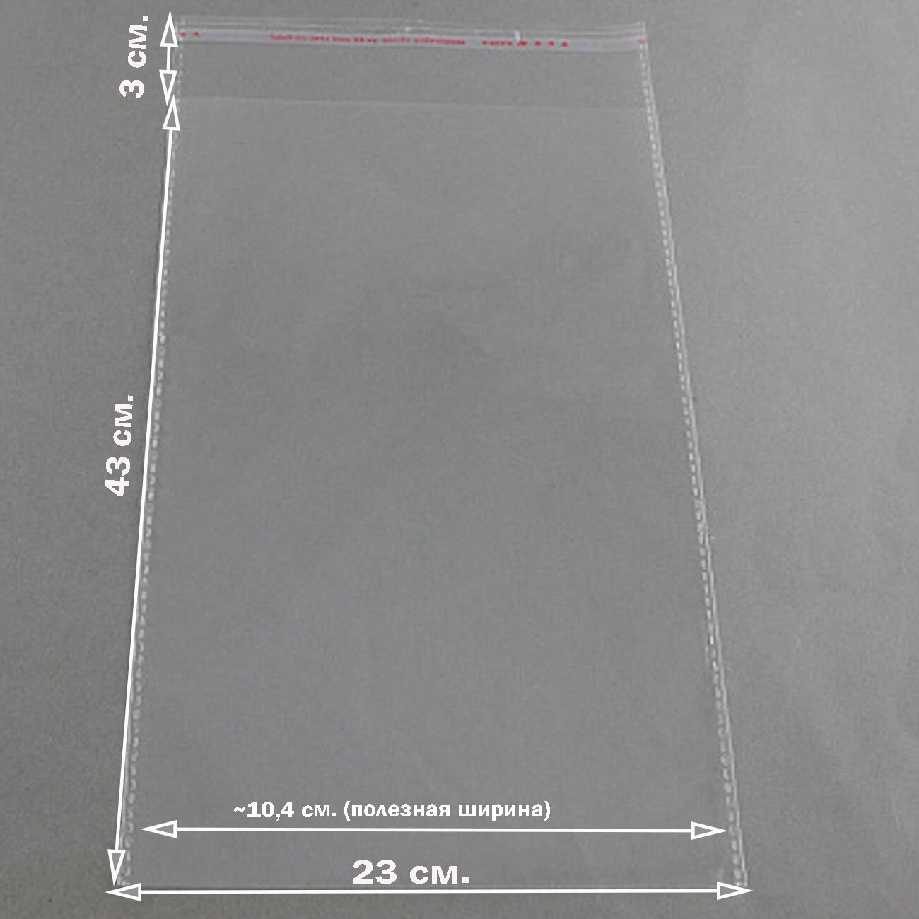 Купить 500 пакетов 23х43+3 см (внутр. размеры 22.4х43 см.) упаковочных бопп прозрачных со скотчем и усиленными швами