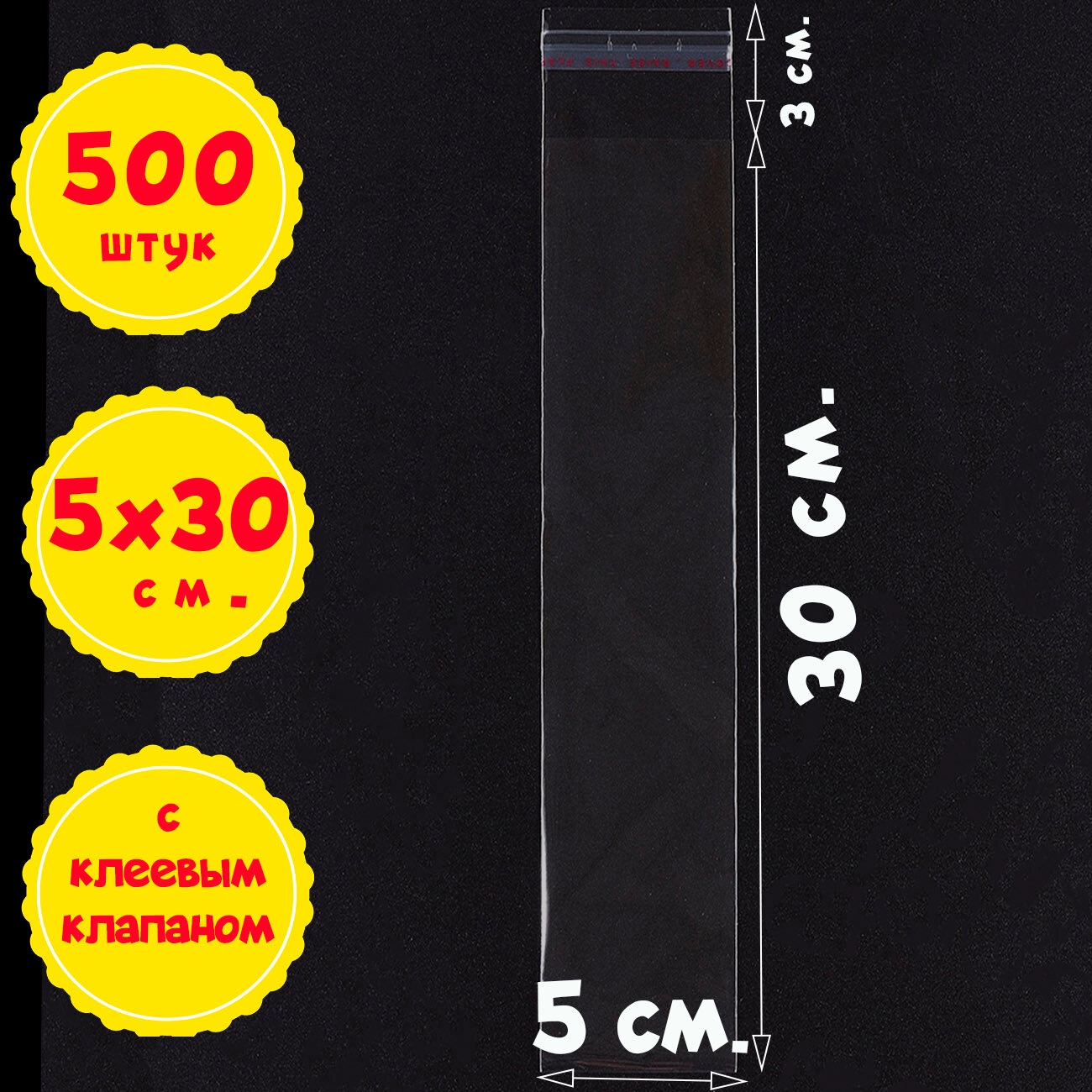 Купить 500 пакетов 5х30+3 см с клеевым клапаном для упаковки из прозрачной пленки бопп