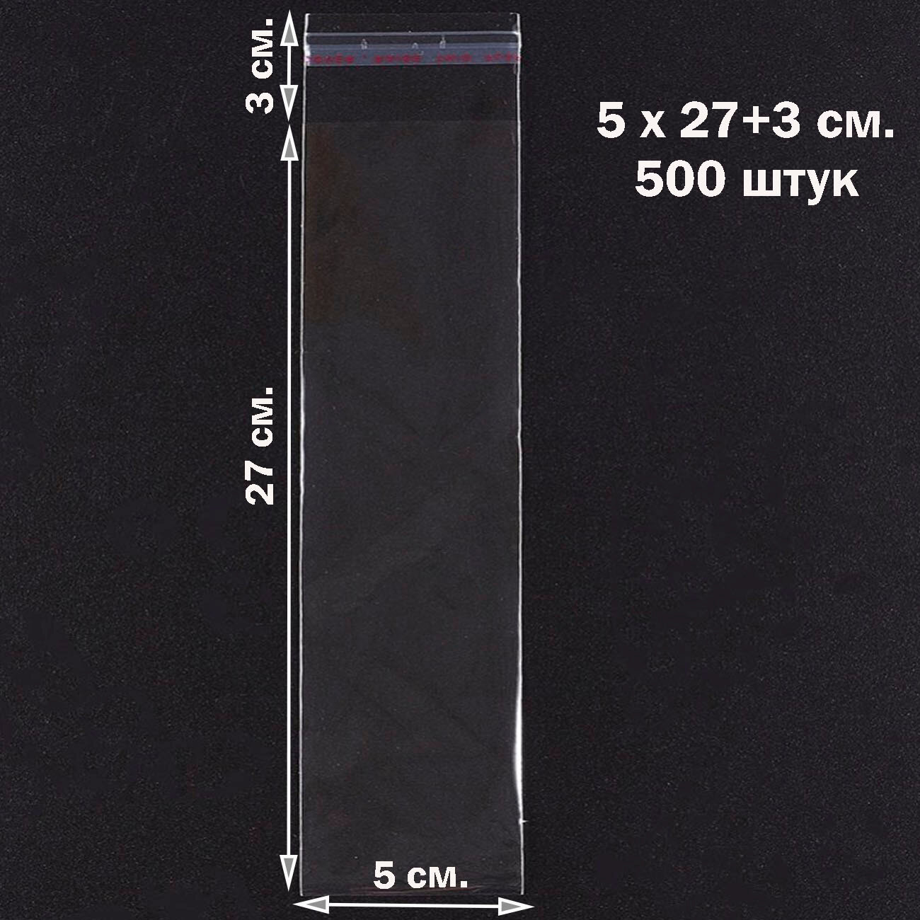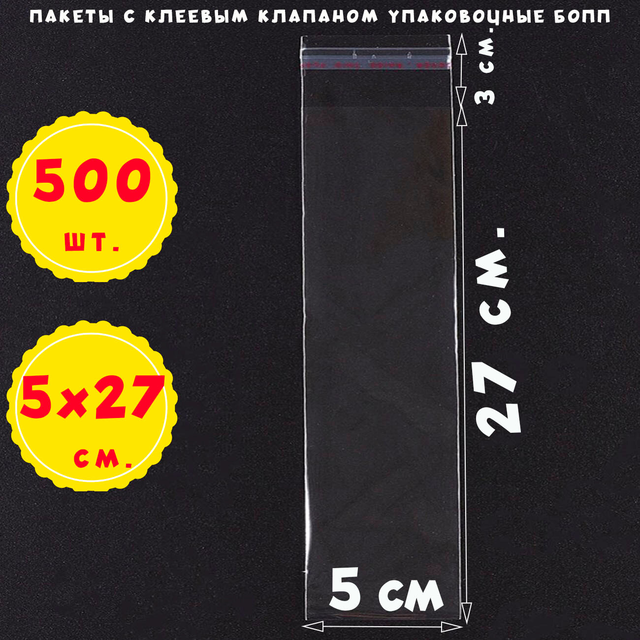 Купить 500 пакетов 5х27+3 см прозрачных с клеевым клапаном для упаковки из пленки бопп