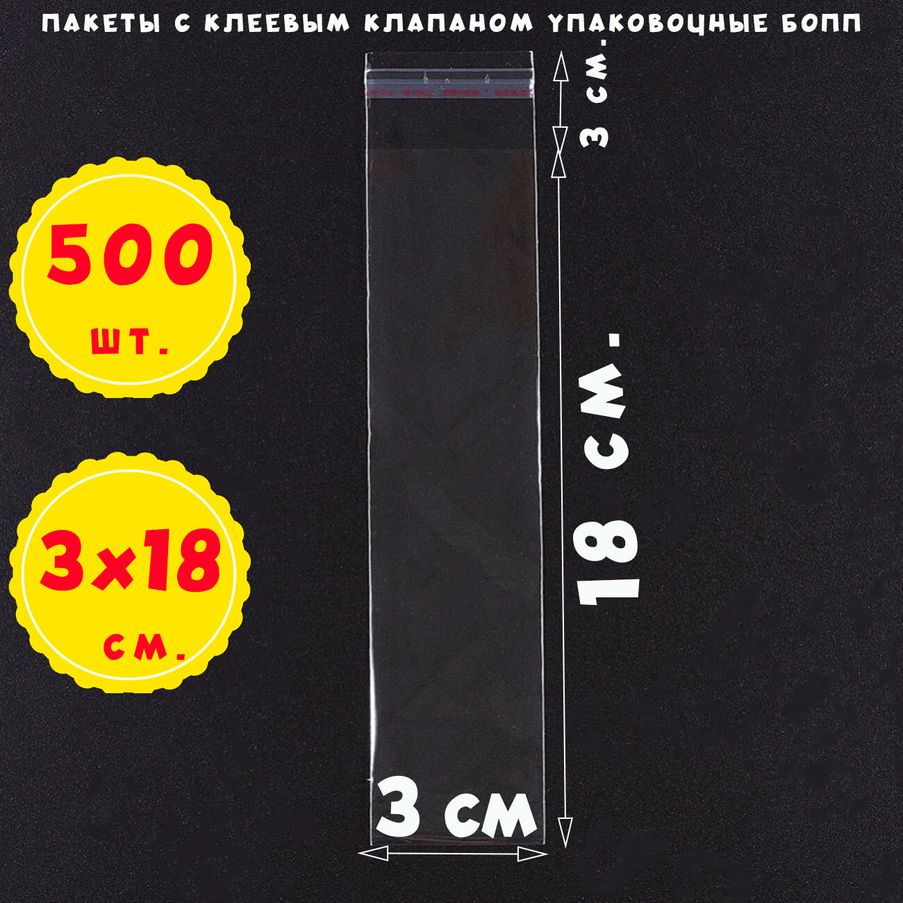 500 пакетов 5х18+3 см прозрачных с клеевым клапаном для упаковки из пленки бопп