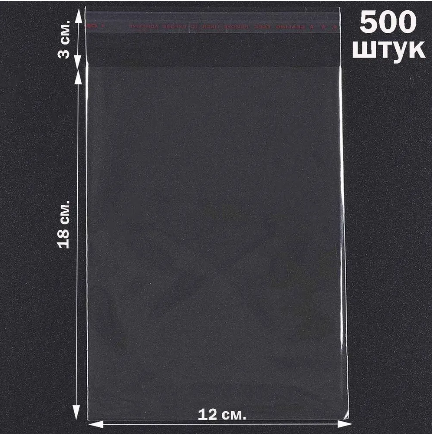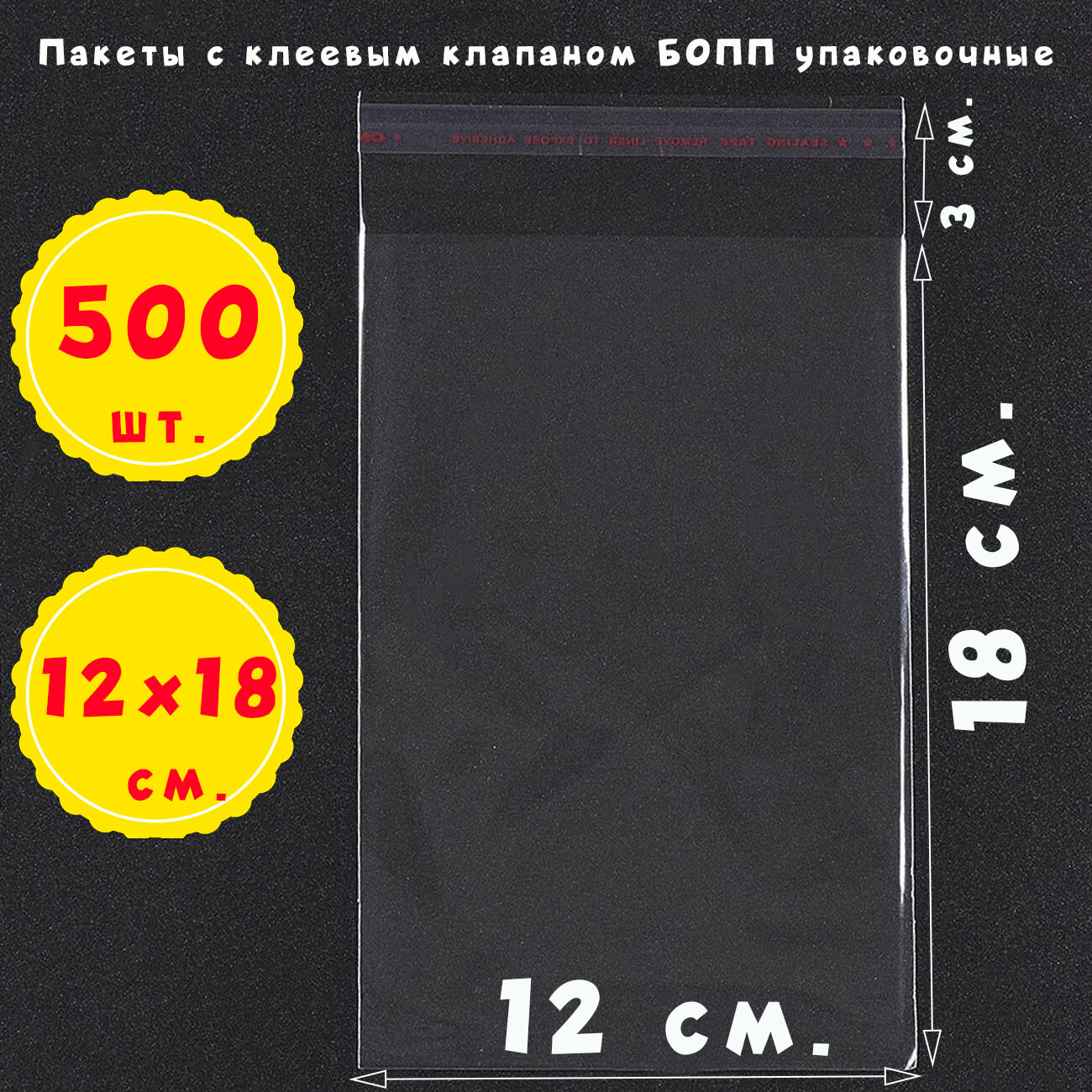 Купить 500 пакетов 12х18+3 см прозрачных с клеевым клапаном для упаковки из пленки бопп