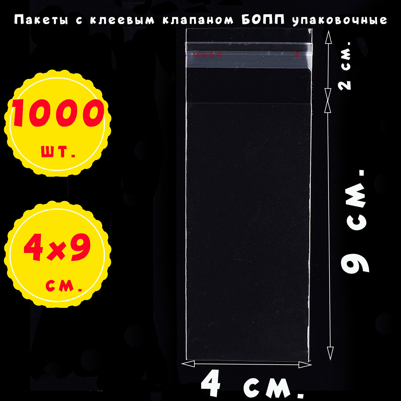 Купить 1000 пакетов 4х9+2 см с клеевым клапаном упаковочные из прозрачной пленки бопп